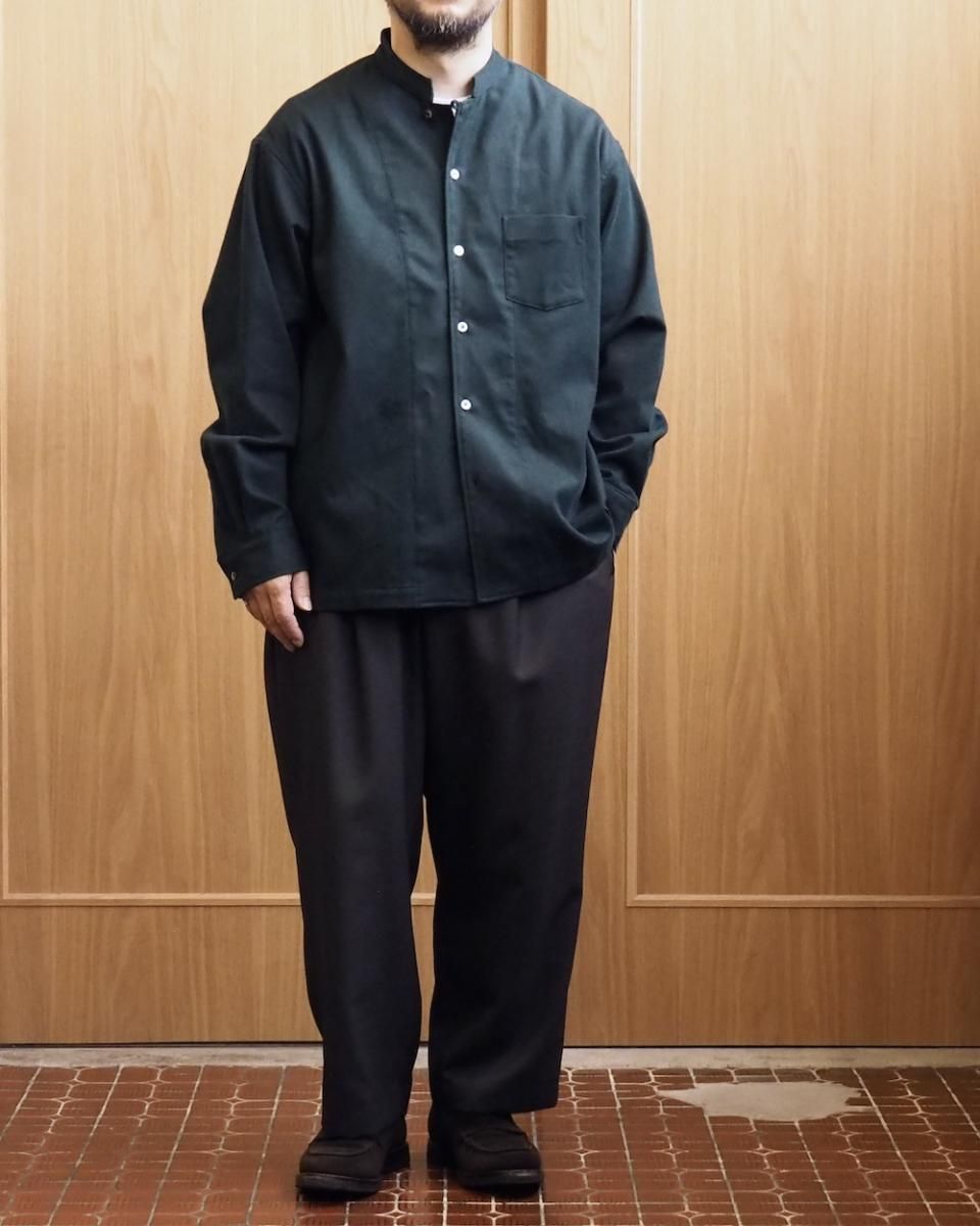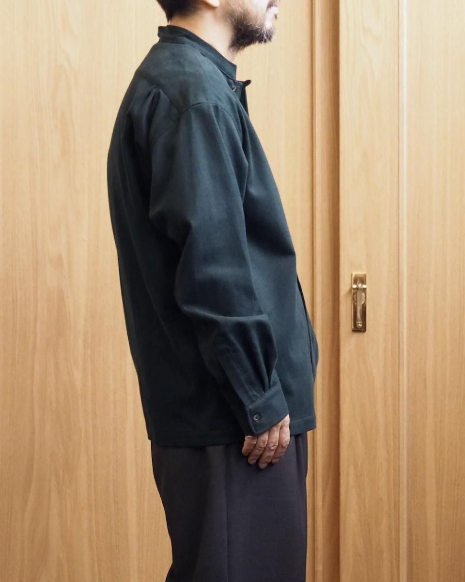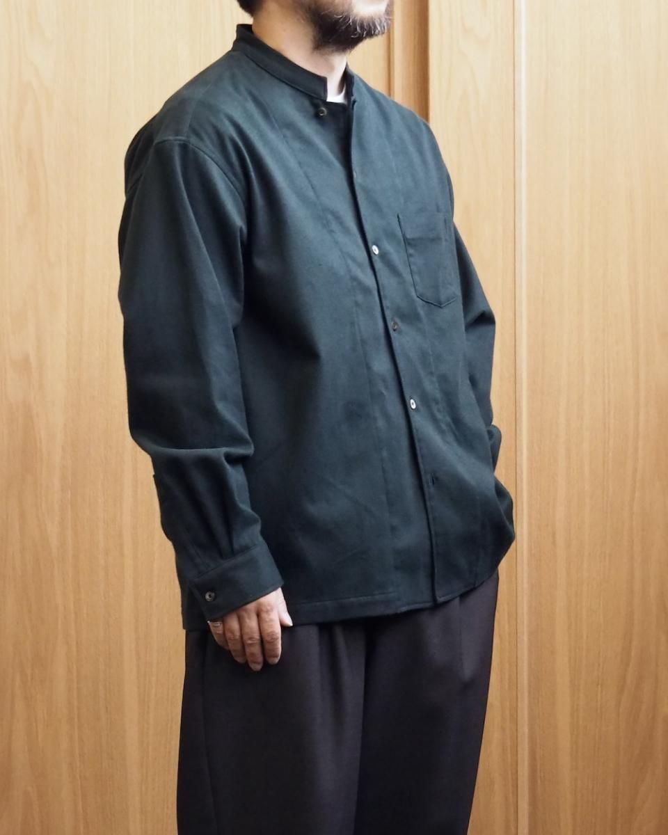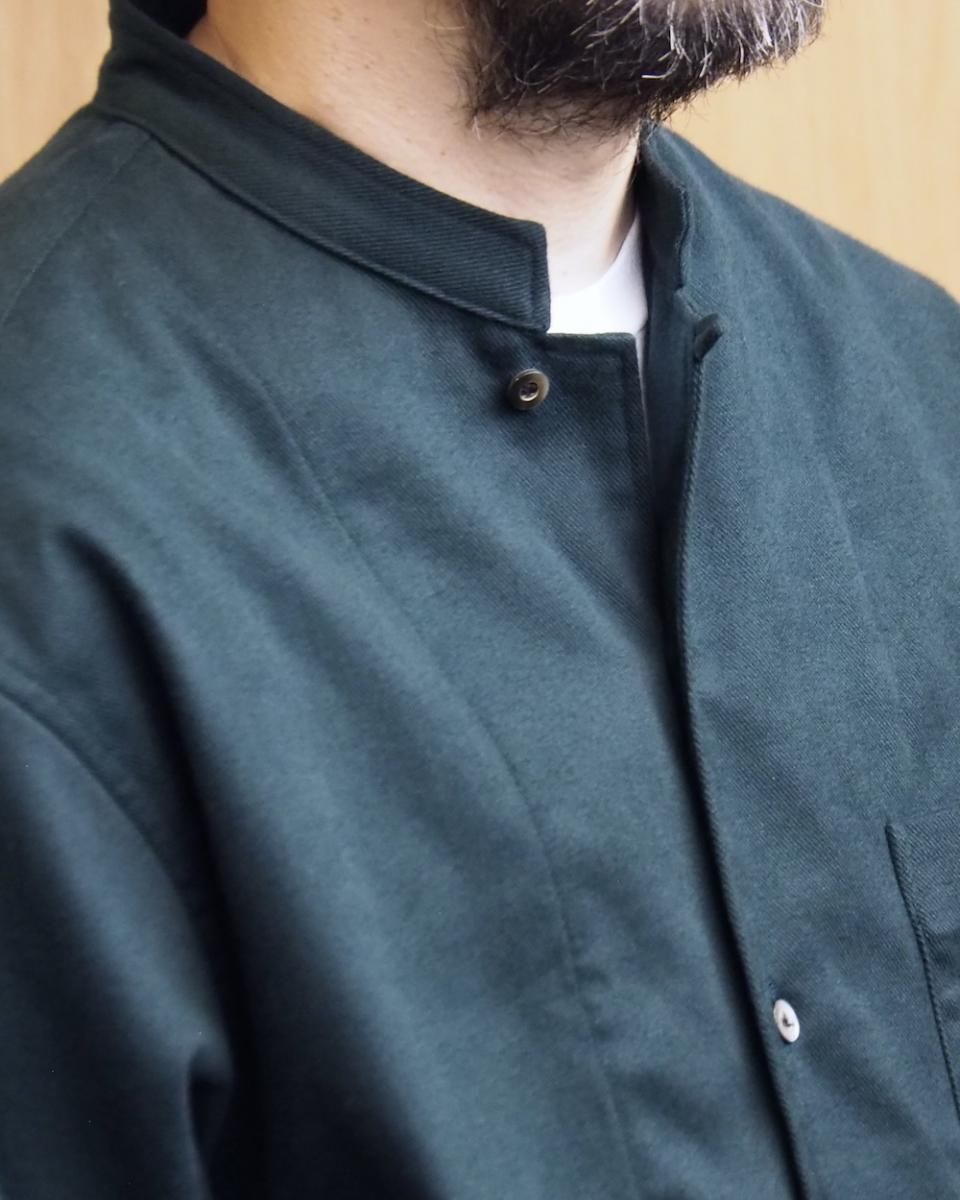 肌当たりの優しい起毛感のあるコットンツイルを使用したシャツ。 ゆったりとしたサイジングにエッジのきいたマオカラーをミックスしたデザイン。 秋口には一枚でシャツとして、また肌寒い時季にはインナー使いとしても着回しのできる一枚。
