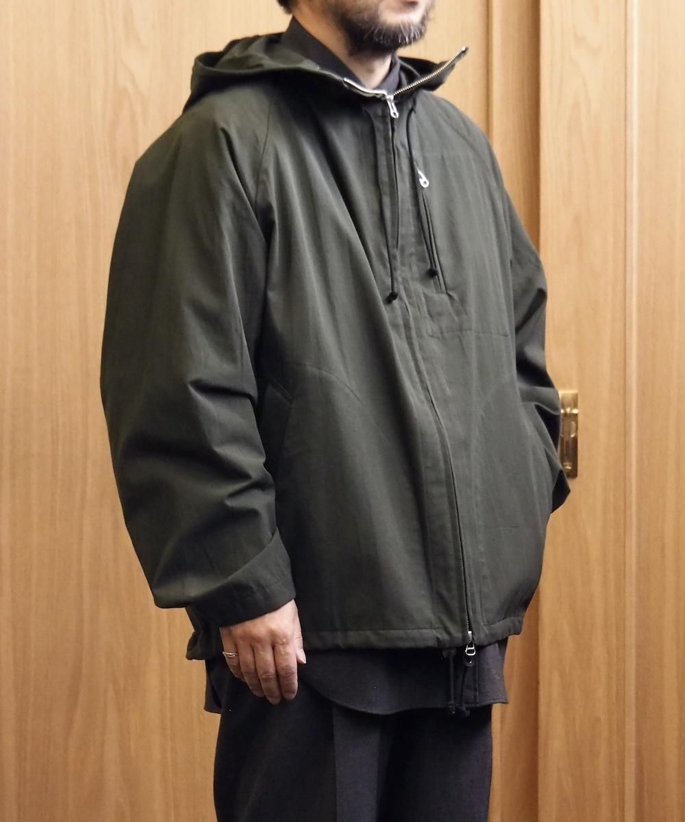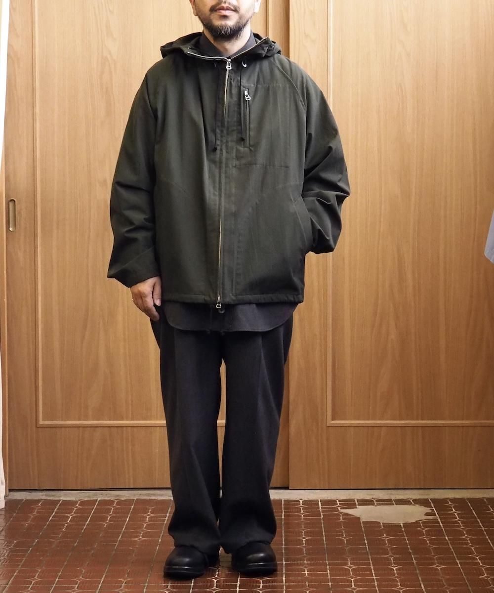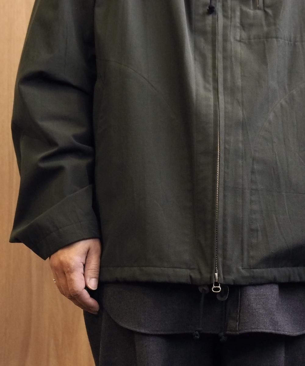 クラシックなミリタリーウェアをインスピレーションに製作した ZIP フードジャケット。 素材には尾州地方の歴史ある機屋で旧式の織機で製織したオリジナル素材を使用。 超長綿を経緯ともに限界まで超高密度で織り上げた平織物。 超長綿の自然な光沢感を最大限に引き出し、無骨さと奥ゆかしさを共存させた表情が特徴です。 製織後に機械を使用せず、長い時間をかけて洗い・乾燥を施すことで、長年身に付けている古布のような馴染みの良い風合いを宿しています。