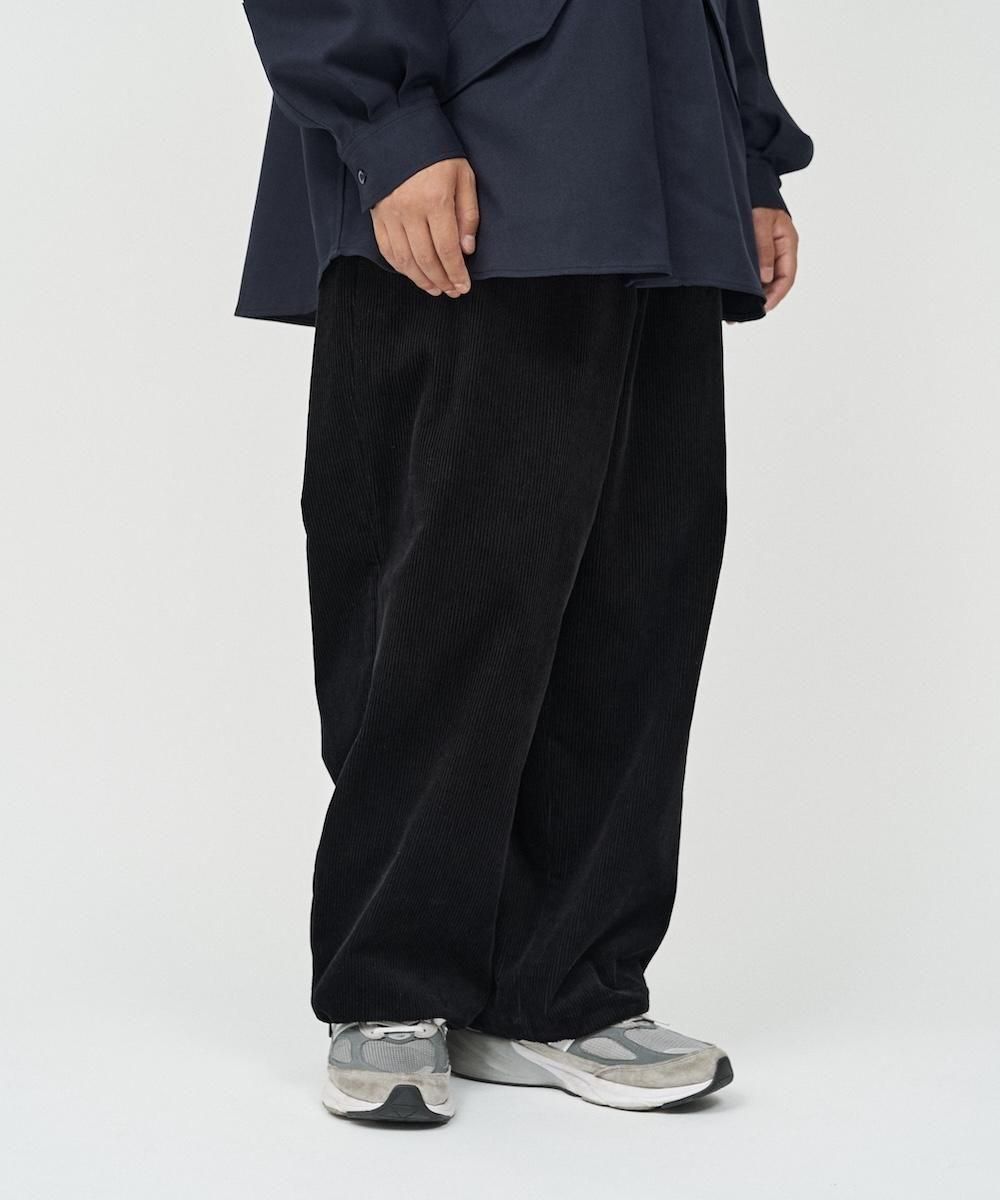 コットンコーデュロイを使用したオーバーパンツ。 しなやかな質感が特徴のコットンのコーデュロイ素材により、上品な面持ちながら天然素材100%ならではの温かみがあり、季節感を演出するのに最適な一本です。 ゆとりのあるオーバーサイズシルエットで、ウエストのみならず、裾にもドローコードを設けてありスタイリングに合わせて調整が可能です。