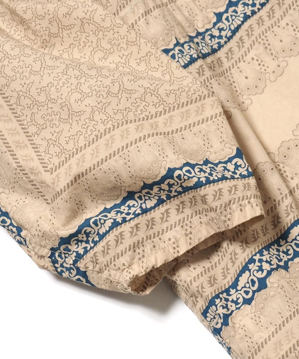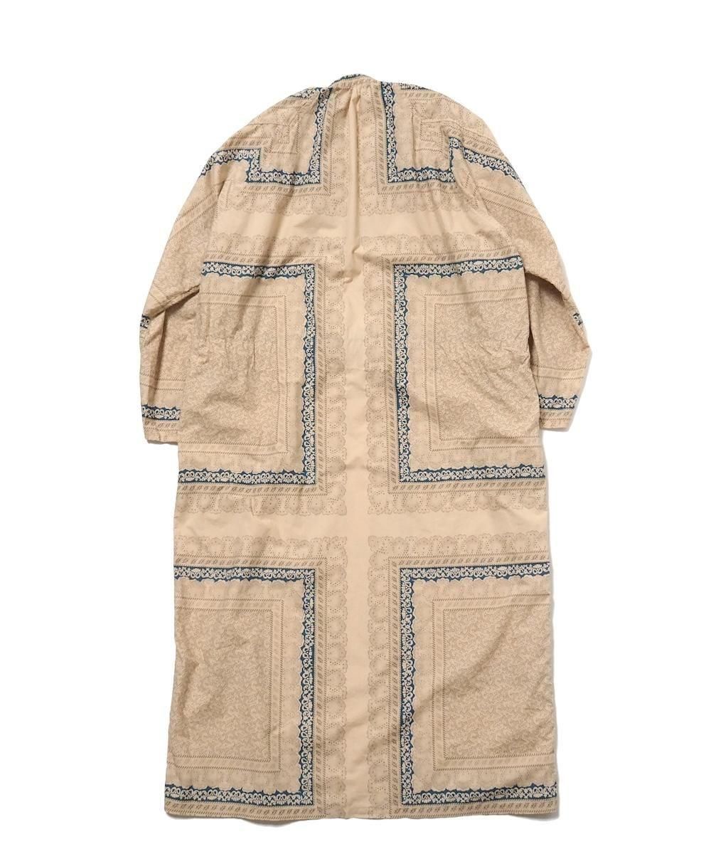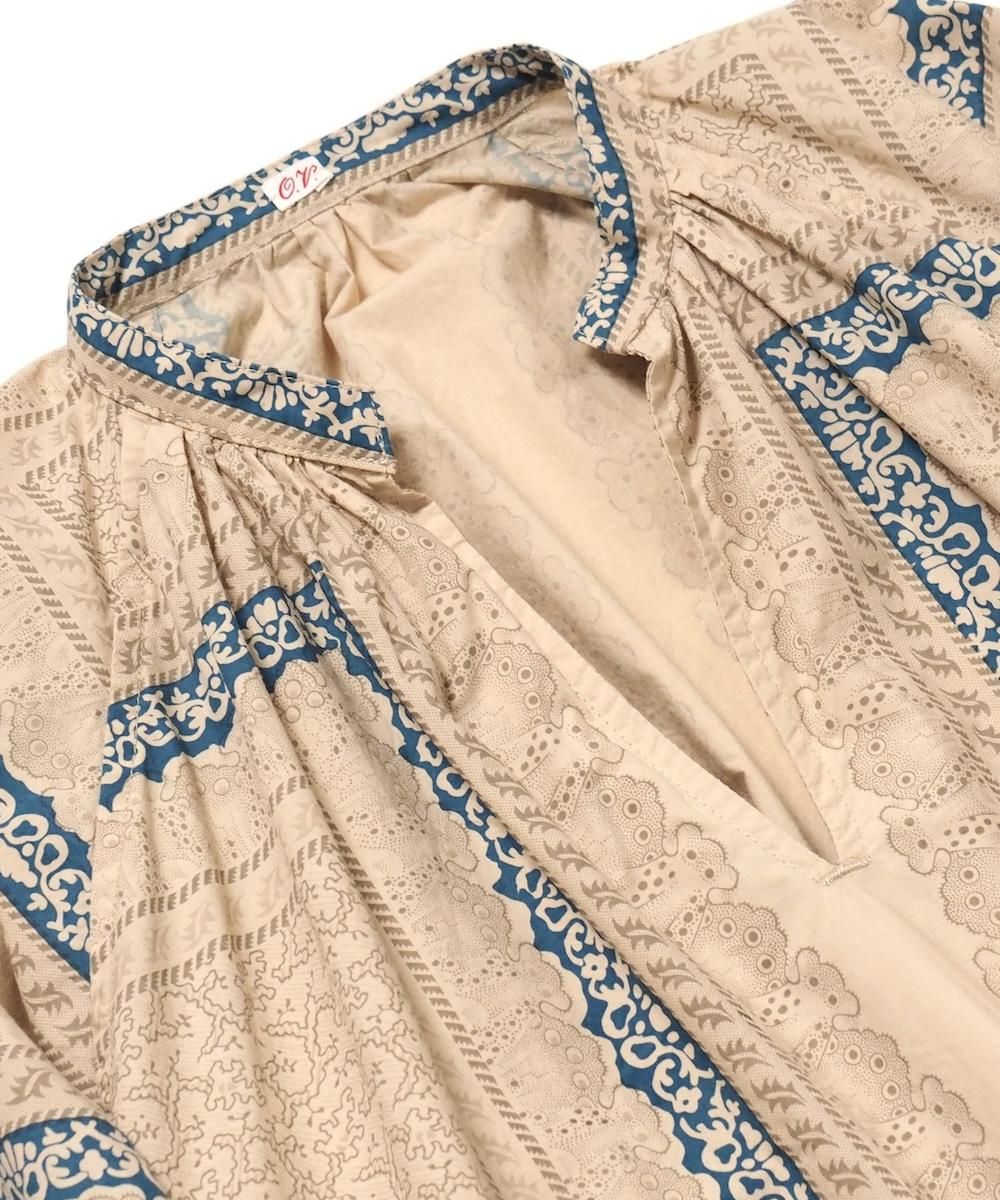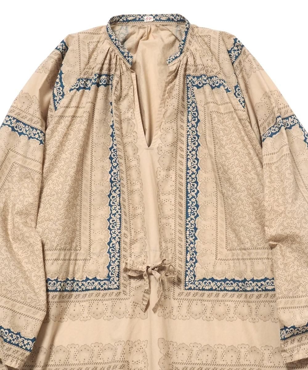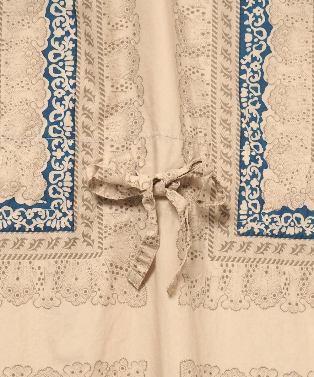 過去のアーカイブから声を多くいただいていた復刻された人気のワンピース。 19世紀フランスのスカーフをモチーフにオリジナル総柄生地で製作されています。 襟元はスキッパー仕様、袖付はアームホールをたっぷりととったラグラン仕様です。 ウエストの紐でブラウジングすればシルエットのアレンジも可能です。