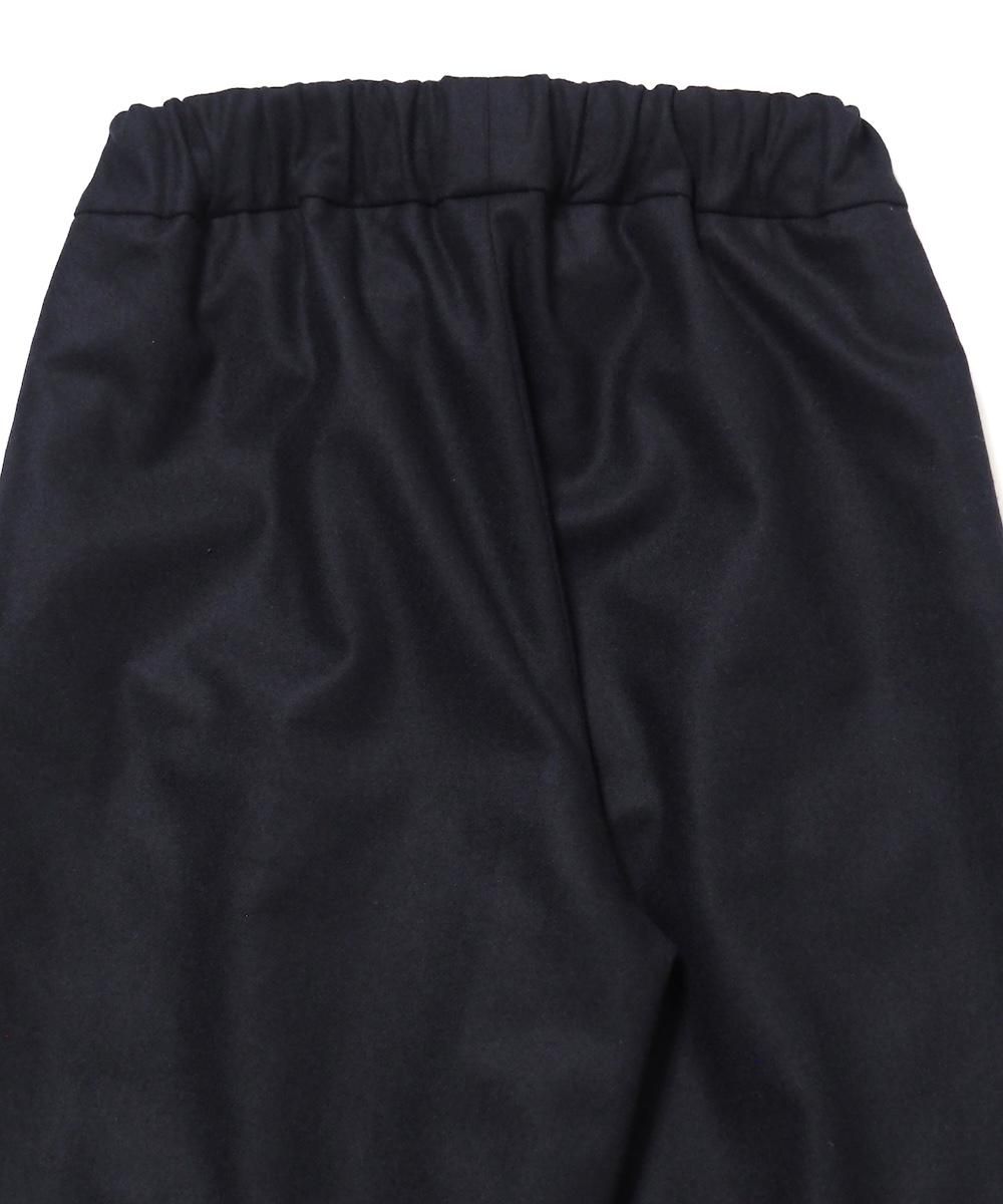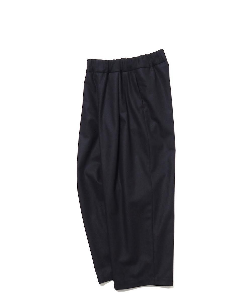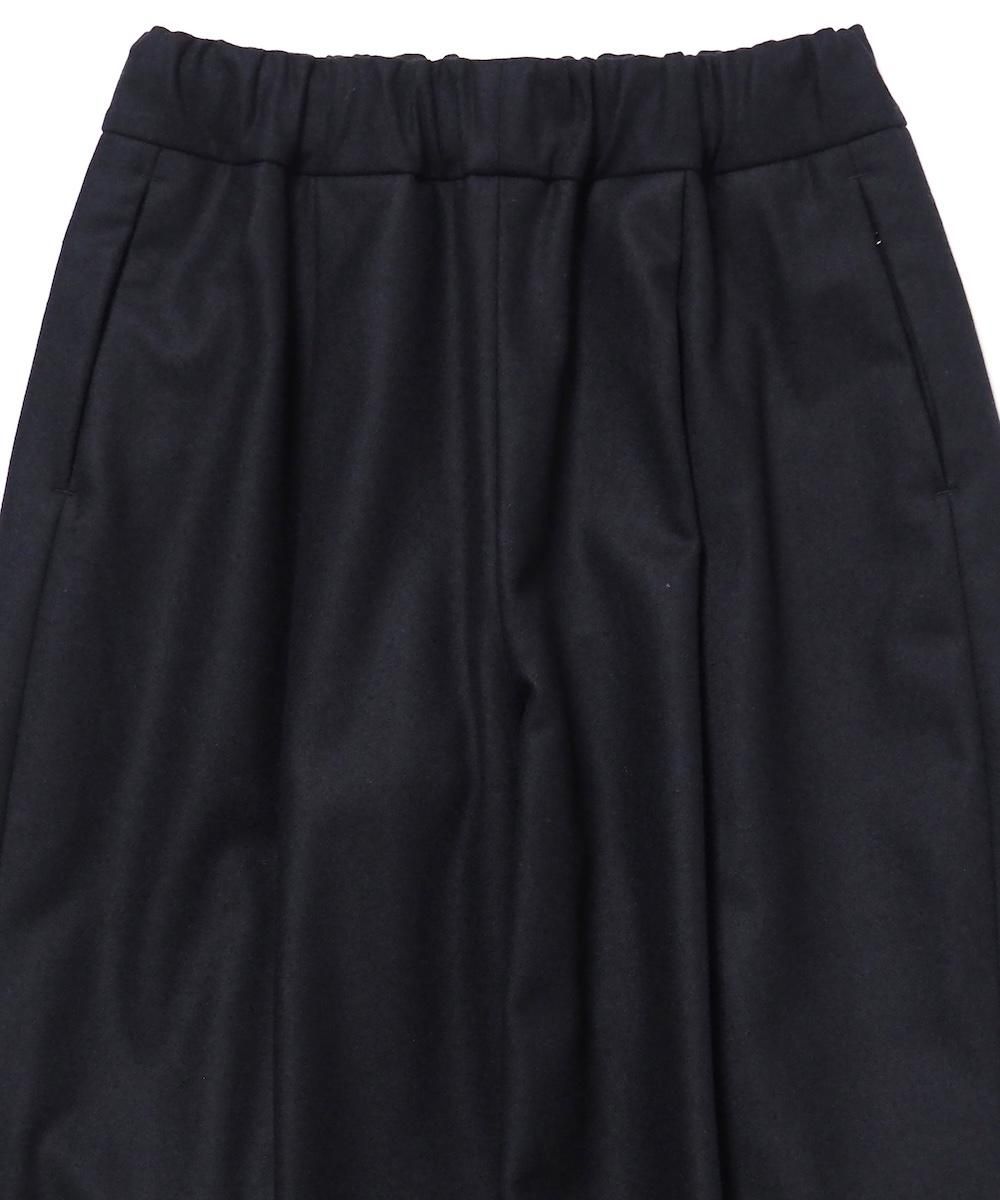 端正なワイドストレートシルエットのウールパンツ。 素材にはメンズライクなスタンダード高密フラノ生地を使用。 メルトンよりも軽量でしっかりとしたハリとコシのある生地感です。 フロント1タック、両サイドにシームポケット、ウエストはゴムと紐で調節可能です。 ※生地に飛び込みやネップ等が見られる場合がありますが、これはこの生地特有の風合いです。