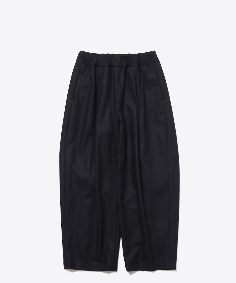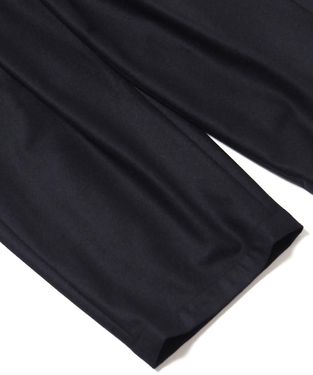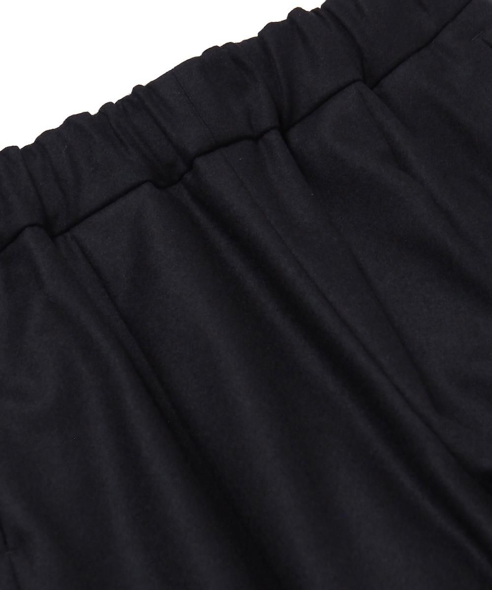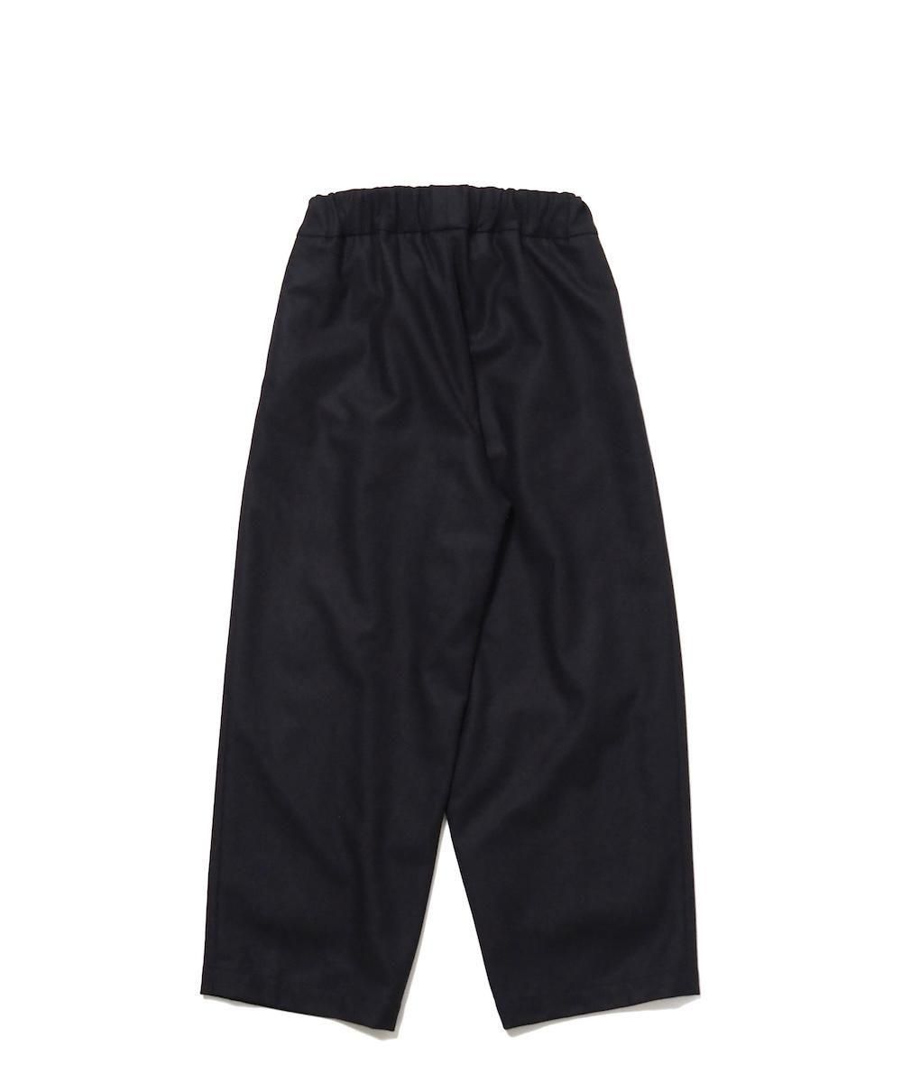 端正なワイドストレートシルエットのウールパンツ。 素材にはメンズライクなスタンダード高密フラノ生地を使用。 メルトンよりも軽量でしっかりとしたハリとコシのある生地感です。 フロント1タック、両サイドにシームポケット、ウエストはゴムと紐で調節可能です。 ※生地に飛び込みやネップ等が見られる場合がありますが、これはこの生地特有の風合いです。