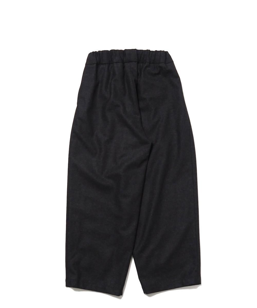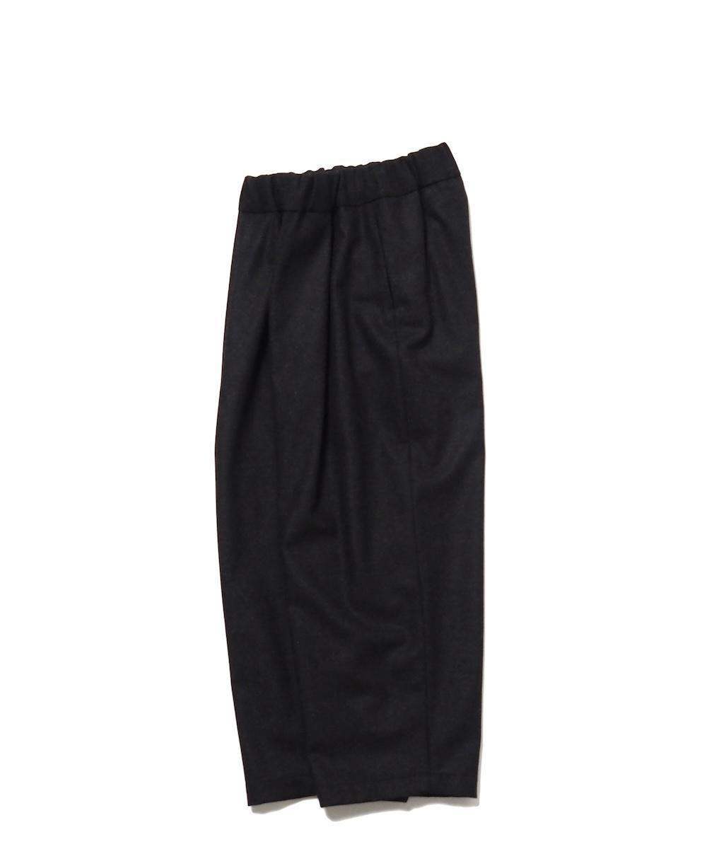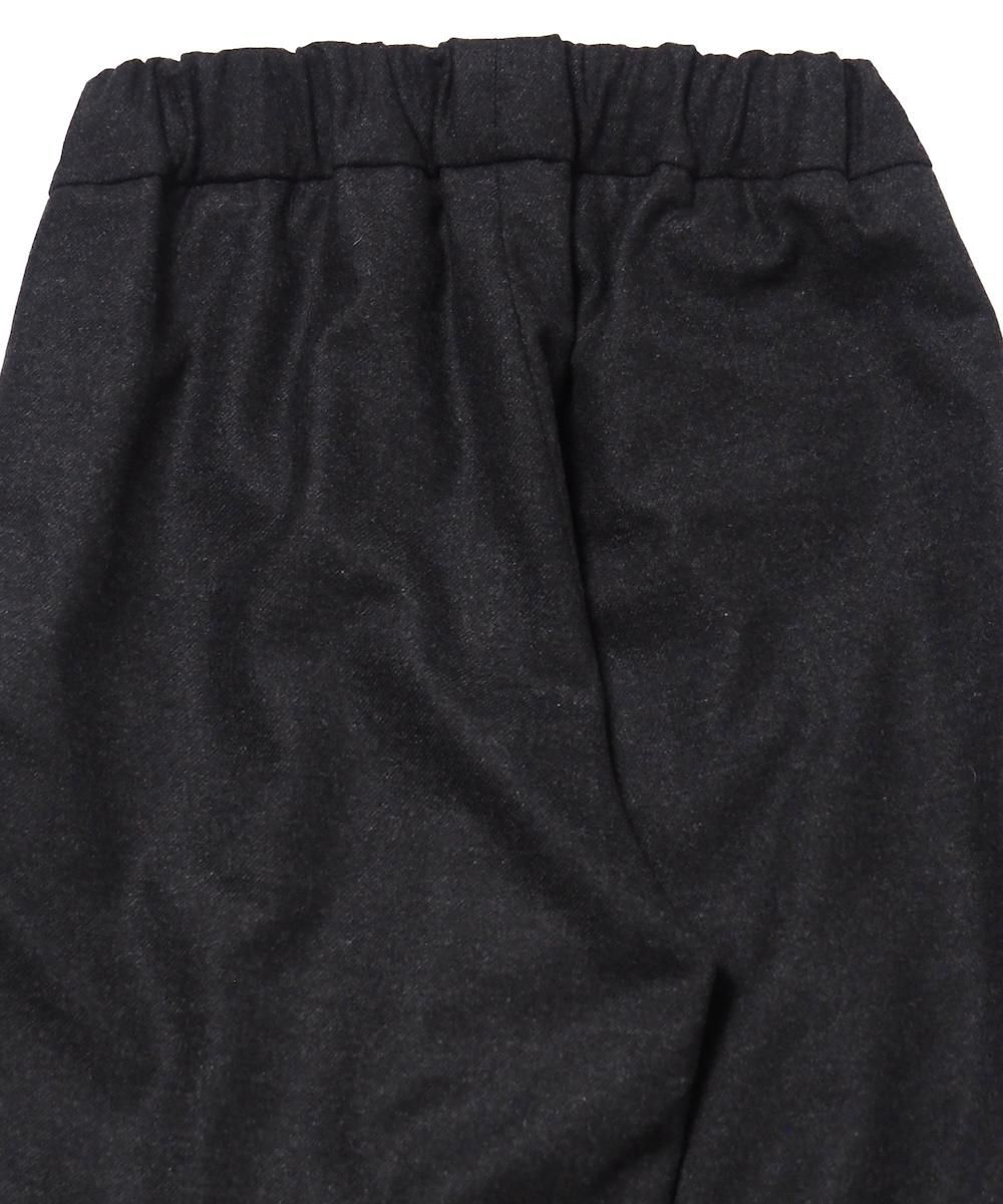 端正なワイドストレートシルエットのウールパンツ。 素材にはメンズライクなスタンダード高密フラノ生地を使用。 メルトンよりも軽量でしっかりとしたハリとコシのある生地感です。 フロント1タック、両サイドにシームポケット、ウエストはゴムと紐で調節可能です。 ※生地に飛び込みやネップ等が見られる場合がありますが、これはこの生地特有の風合いです。