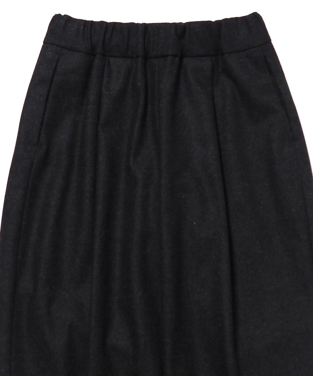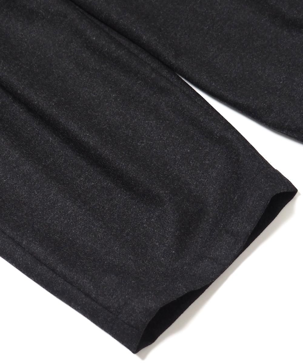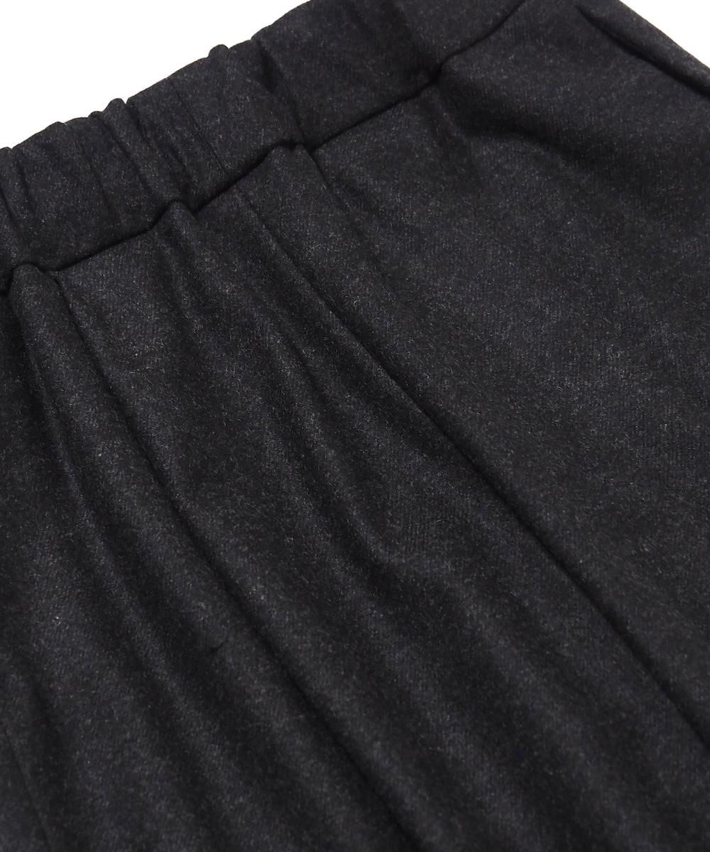 端正なワイドストレートシルエットのウールパンツ。 素材にはメンズライクなスタンダード高密フラノ生地を使用。 メルトンよりも軽量でしっかりとしたハリとコシのある生地感です。 フロント1タック、両サイドにシームポケット、ウエストはゴムと紐で調節可能です。 ※生地に飛び込みやネップ等が見られる場合がありますが、これはこの生地特有の風合いです。
