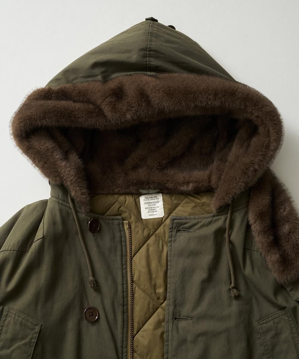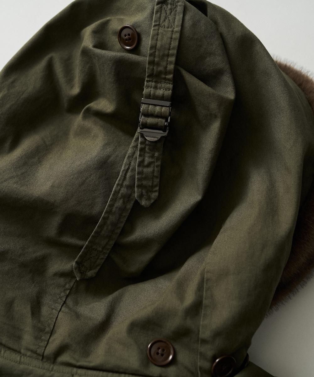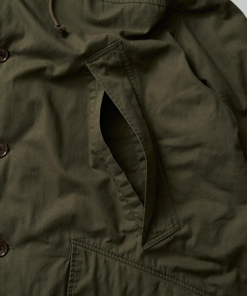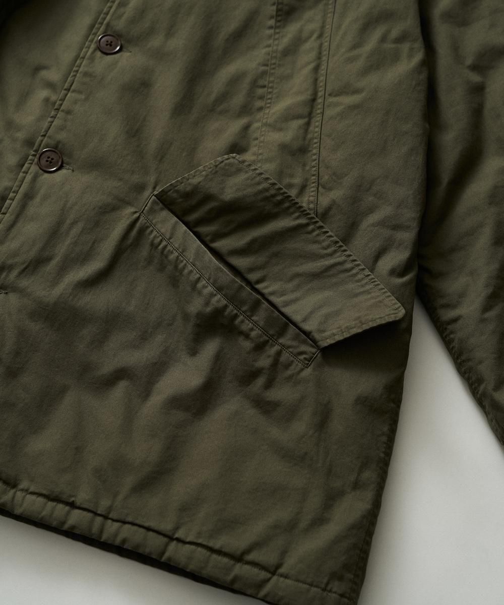 1943年~1944年の2年間のみ製作された US ARMY の B-9 フライトジャケットは、 極寒の地域での着用を目的に開発されており、 キルティングのダウンライナーや、フード・チンストラップのボアにより優れた防寒性を誇ります。 デイリーユースでの使用のために中綿は軽いものを採用。 表地も中綿とのバランスを考慮し、オリジナルを踏襲しつつ密度を落として見た目に反して軽い仕上がりにするなど、現代的なアップデートを加えています。