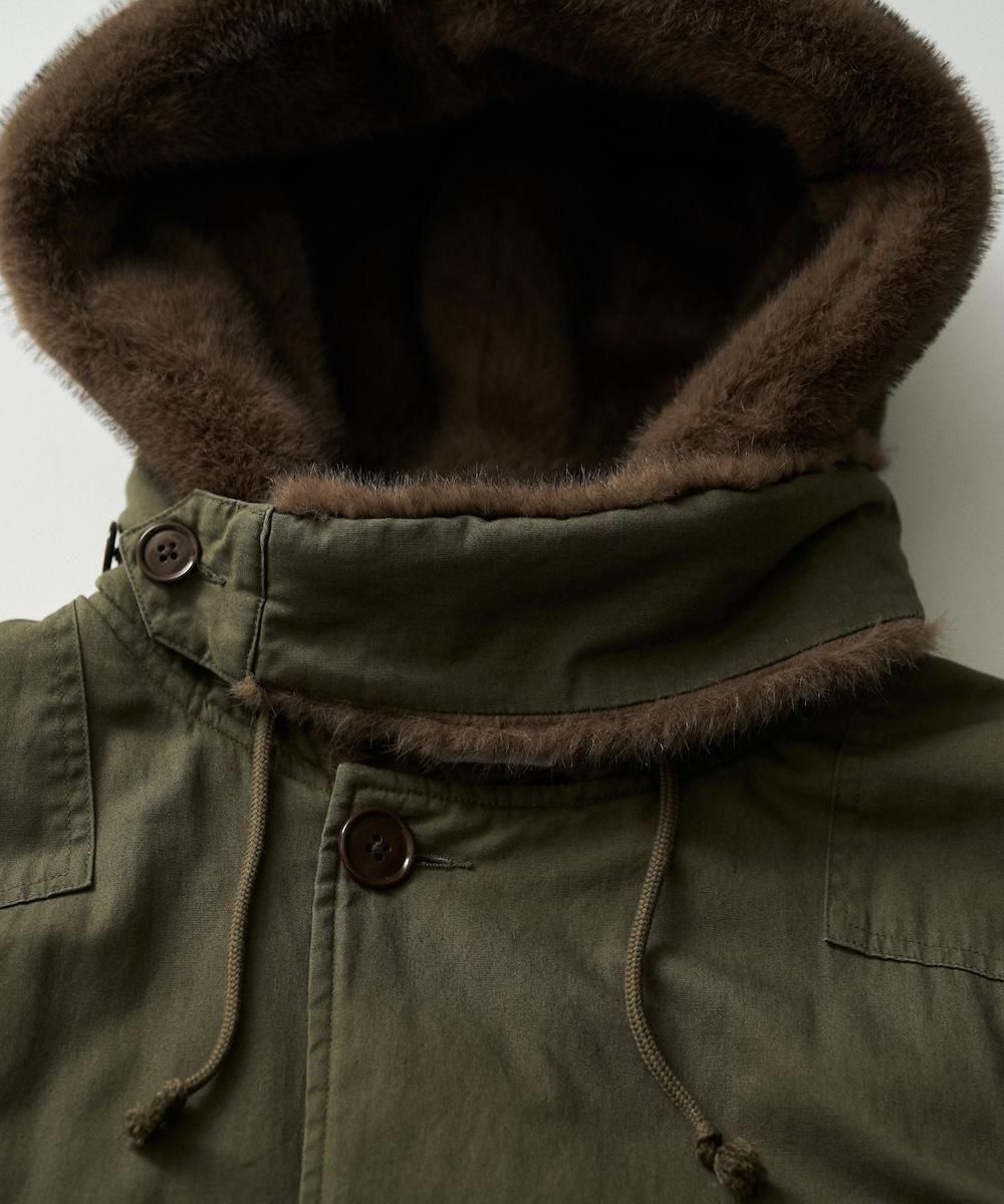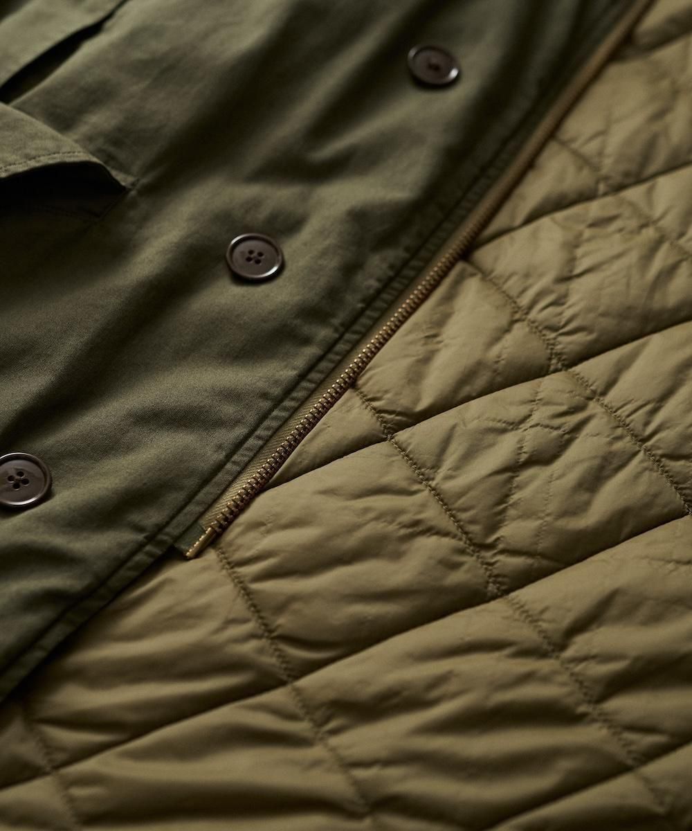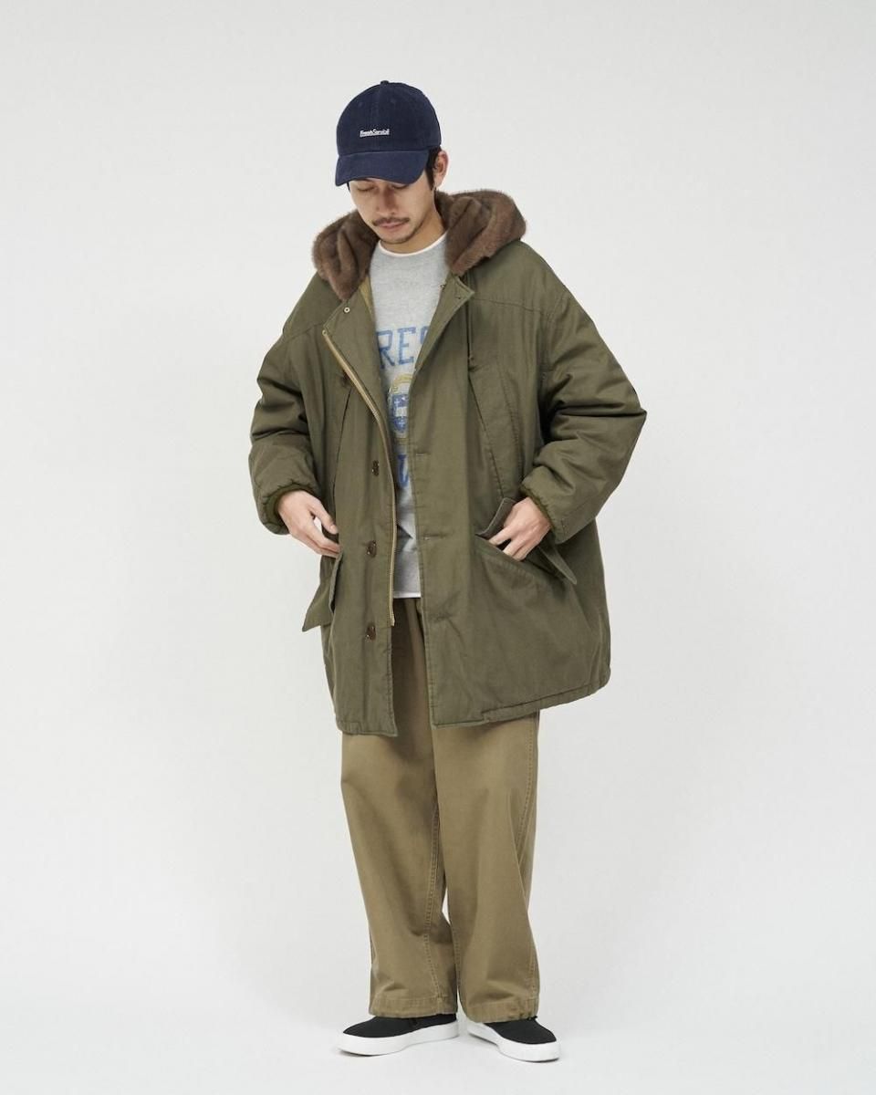 1943年~1944年の2年間のみ製作された US ARMY の B-9 フライトジャケットは、 極寒の地域での着用を目的に開発されており、 キルティングのダウンライナーや、フード・チンストラップのボアにより優れた防寒性を誇ります。 デイリーユースでの使用のために中綿は軽いものを採用。 表地も中綿とのバランスを考慮し、オリジナルを踏襲しつつ密度を落として見た目に反して軽い仕上がりにするなど、現代的なアップデートを加えています。