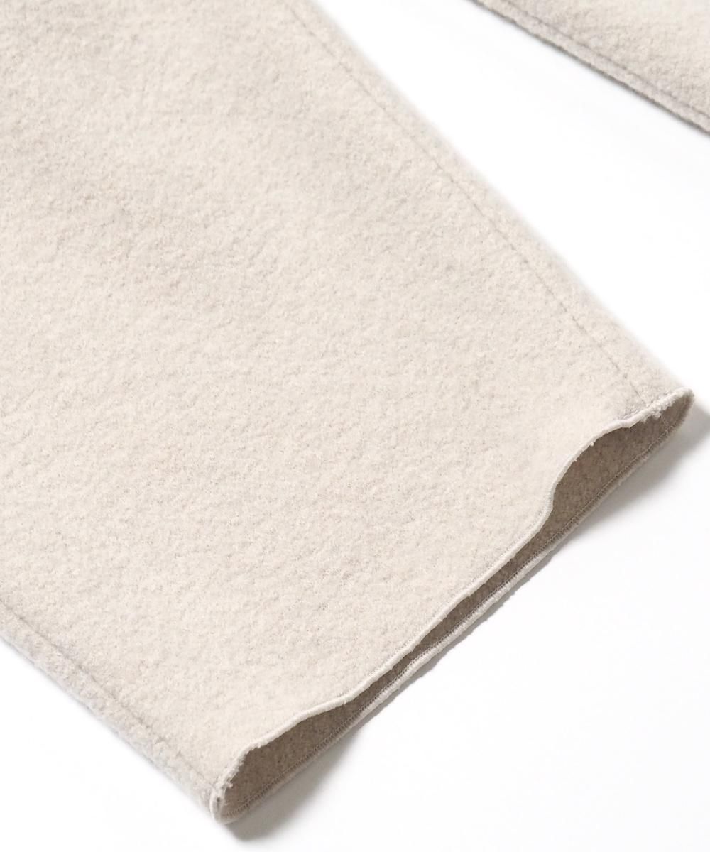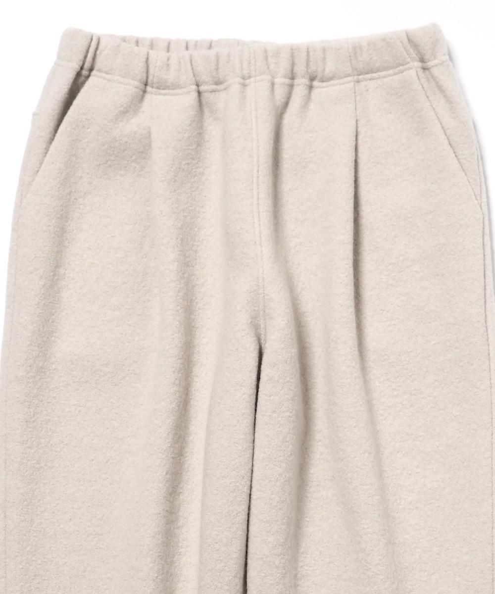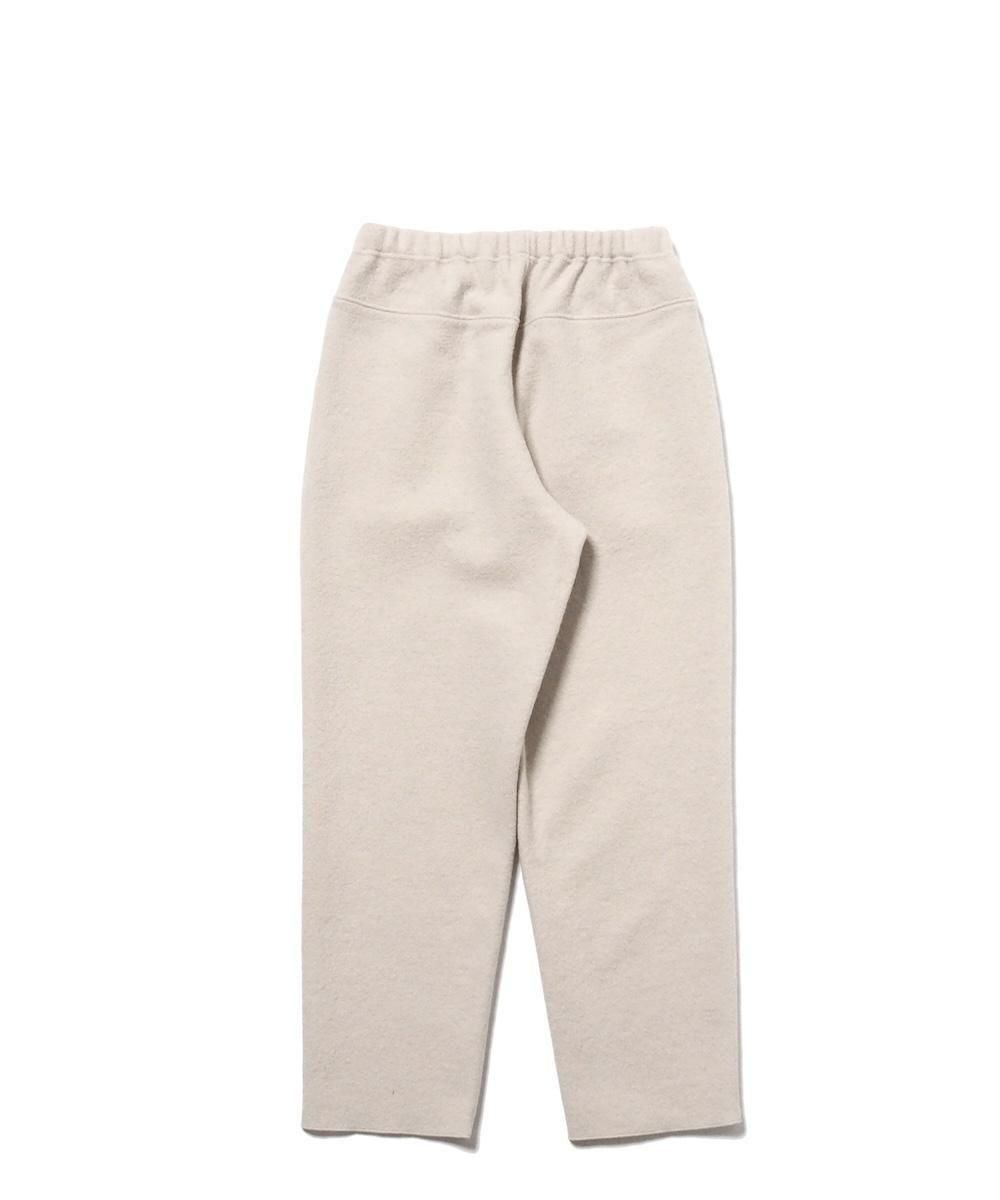 evam eva 定番のプレスウールイージーパンツ。 柔らかなウール糸で編んだニット地を圧縮することで、しっかりとした生地に仕上がっています。 程良いゆとりがありながら足元にかけてすっきりとした印象のテーパードシルエット。 ふっくらと優しい肌当たりで、軽い履き心地のため、寒い季節におすすめです。 生地の暖かさをしっかりと感じられるこのパンツは、特にリピーターの多い大定番アイテムです。