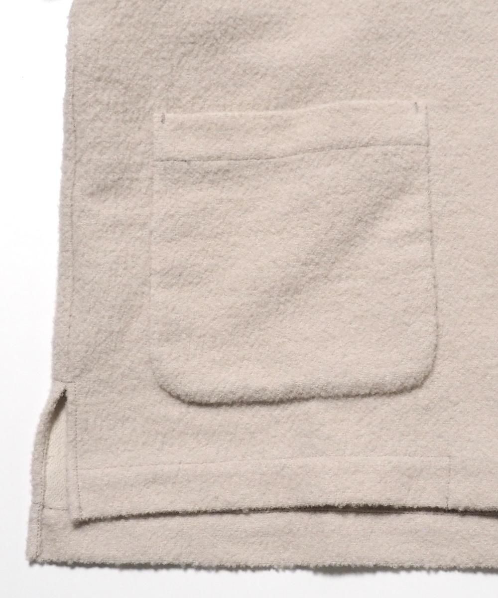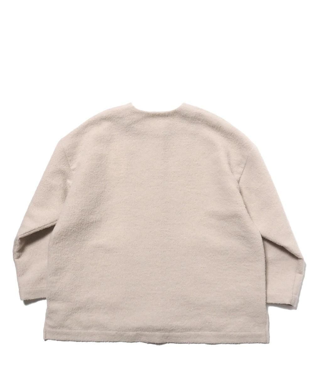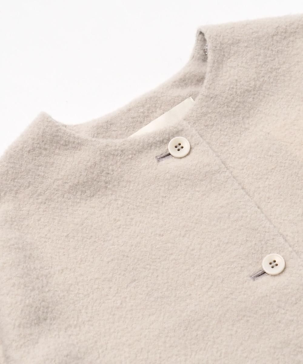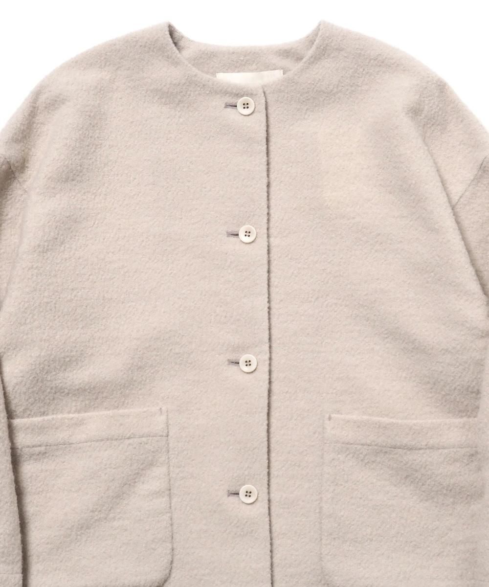 すっきりとしたノーカラーのウールジャケット。 表には不規則的なループ状のウールブークレー糸を、裏にはコットン糸を使用した、表情の豊かなオリジナル生地です。 冬の入りを感じるような表情で見た目よりさらりと軽い着心地なので、秋にも手軽に取り入れられるアイテムです。