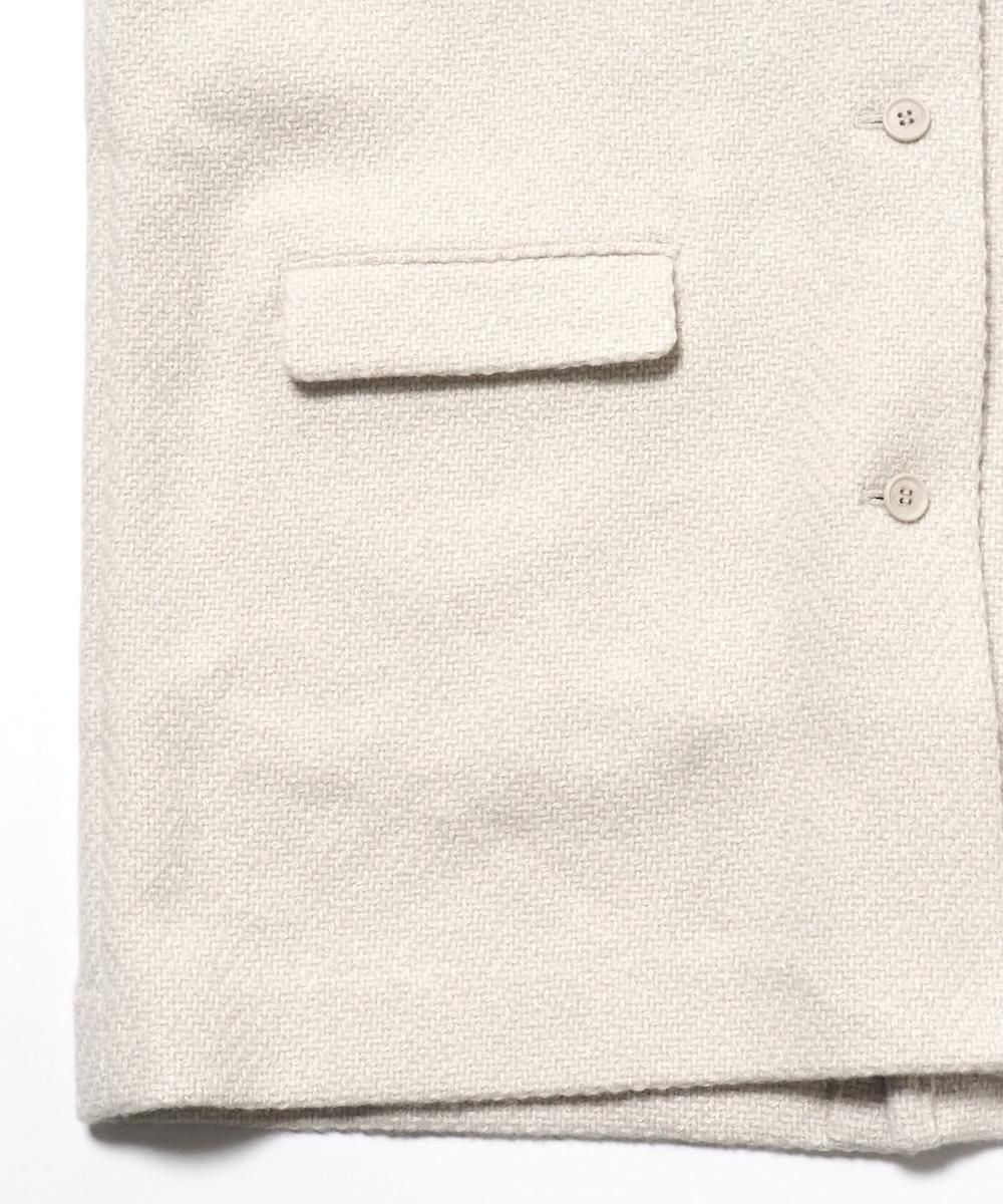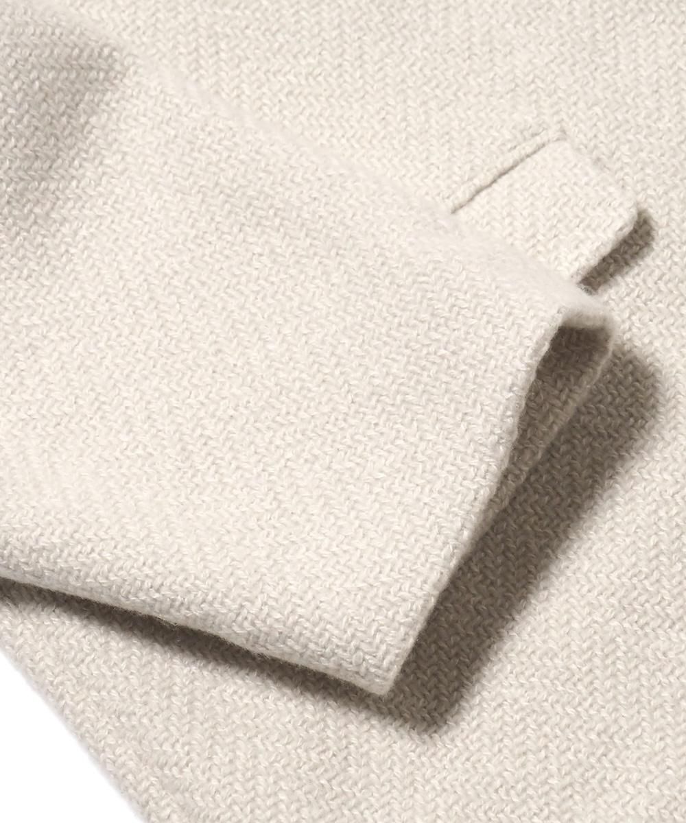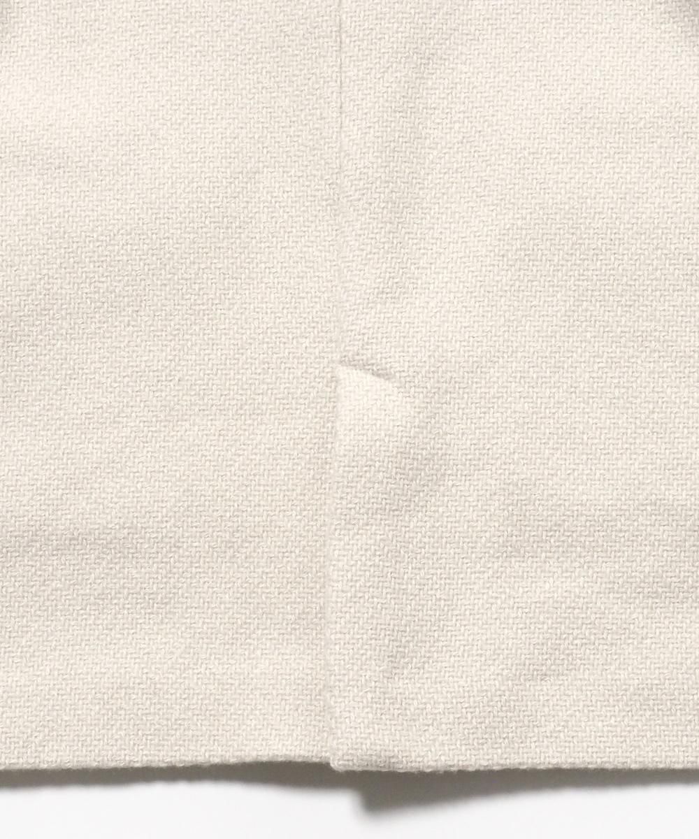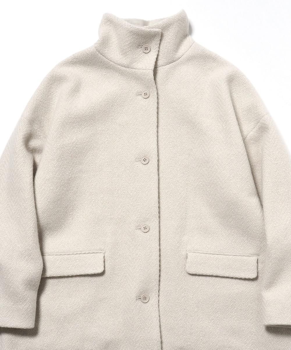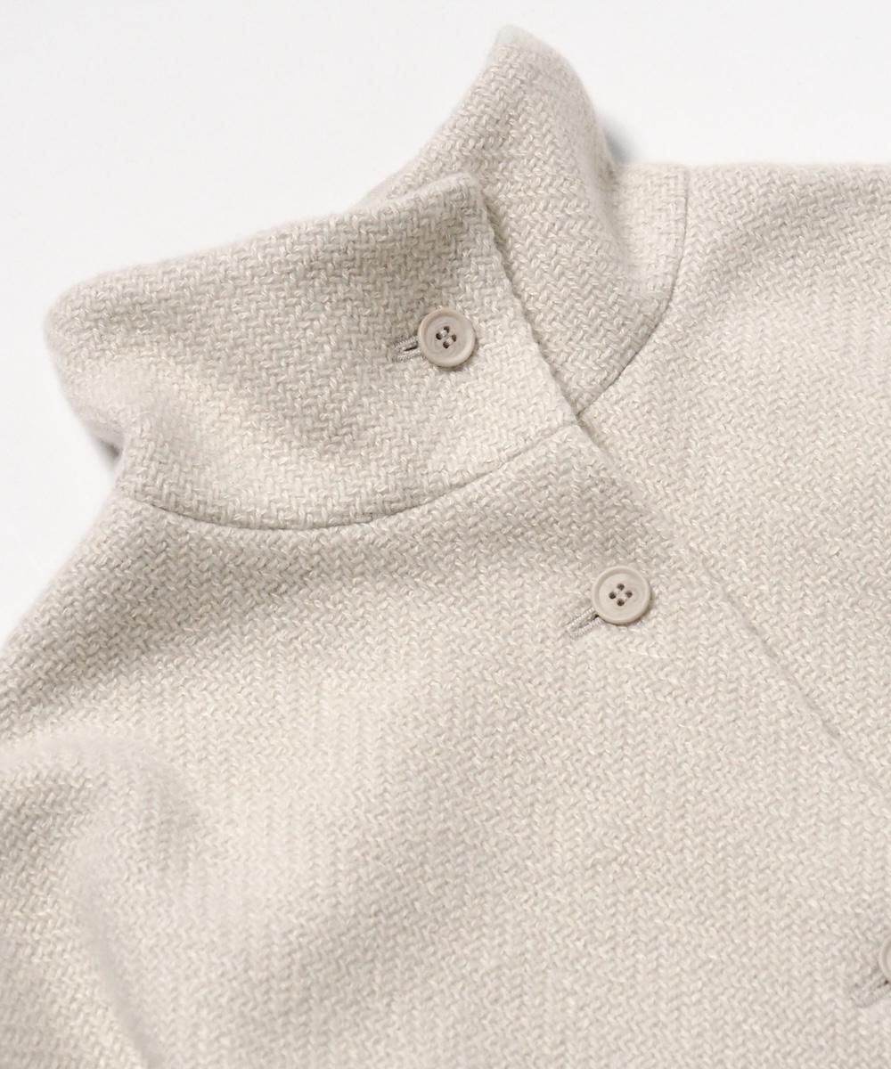 大きめの襟がが印象的なスタンドカラーコート。 プレスウールシリーズから残る端材を粉砕して、新たな糸に生まれ変わったrenew-woolを使用。 renew-woolの糸の存在を感じる太番手の織り糸と、同色に染めたシルクの糸が見え隠れするざっくりとした織り目が、とても洗練された品のある表情になっています。 身幅・肩幅を広くとり、ざっくりとラフに羽織れることに加え、インナーに着込むことも可能です。 腰回しが隠れるほどの丈感で、寒い時期に優しく暖かく着用いただけます。