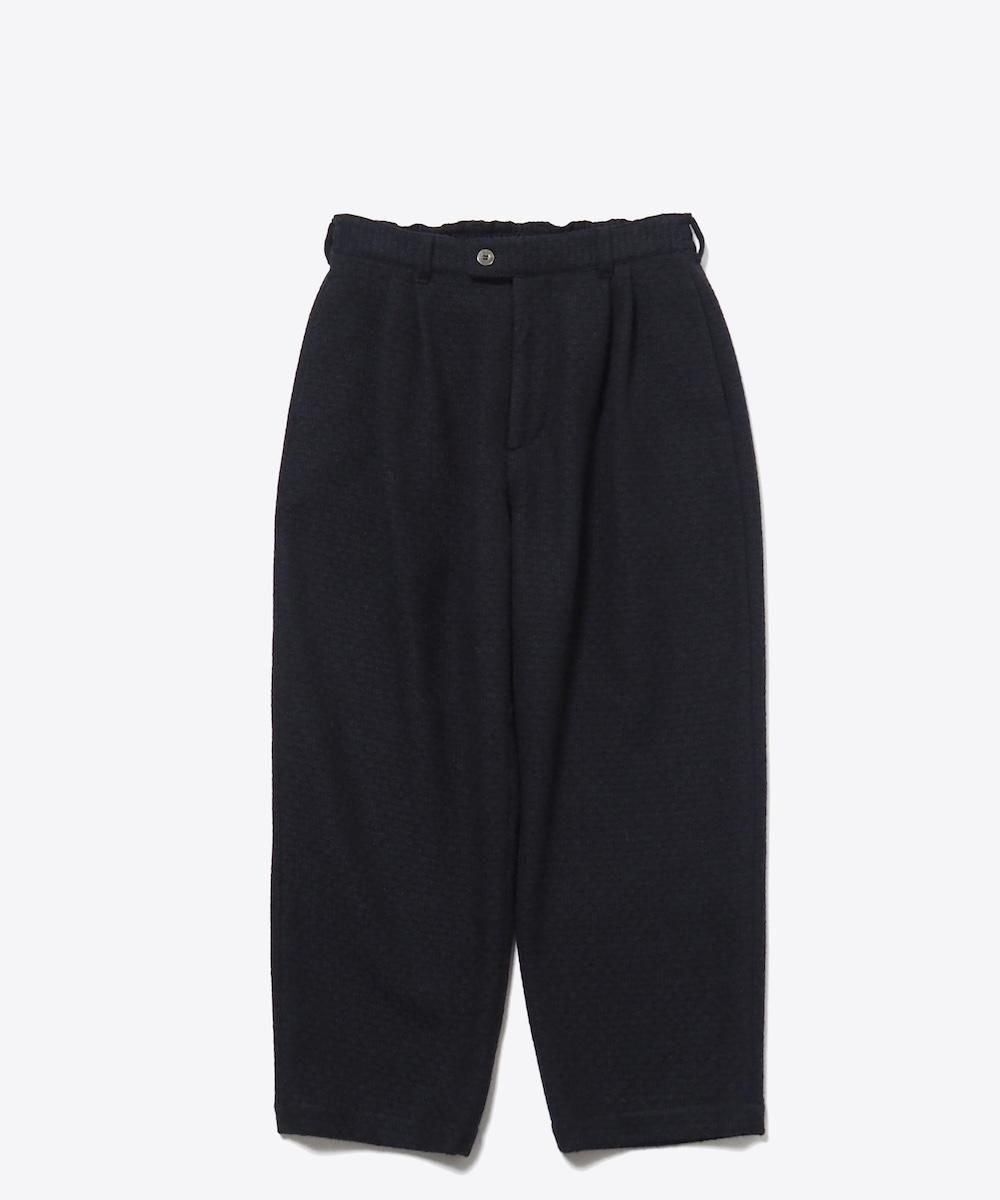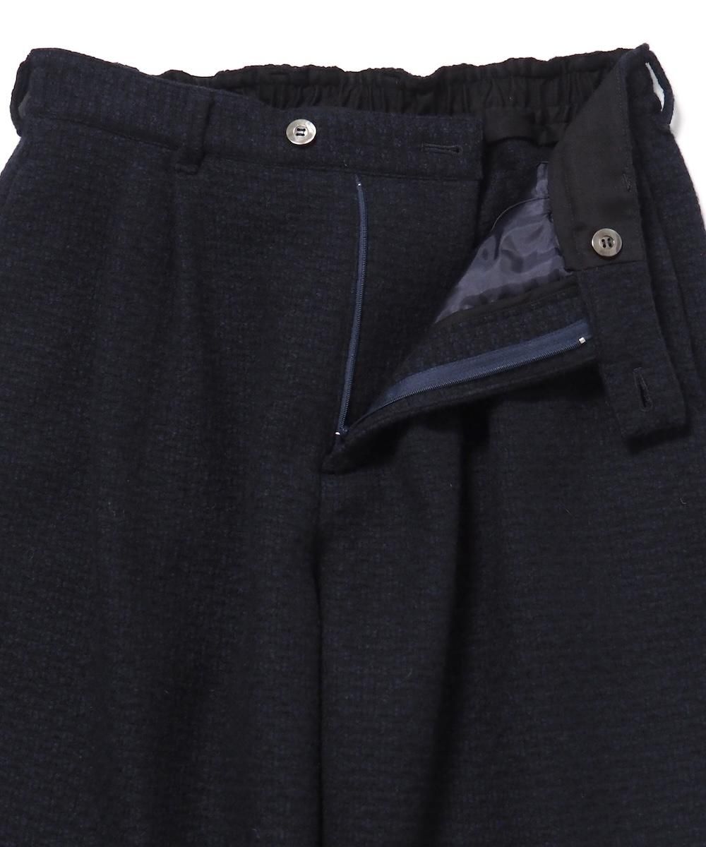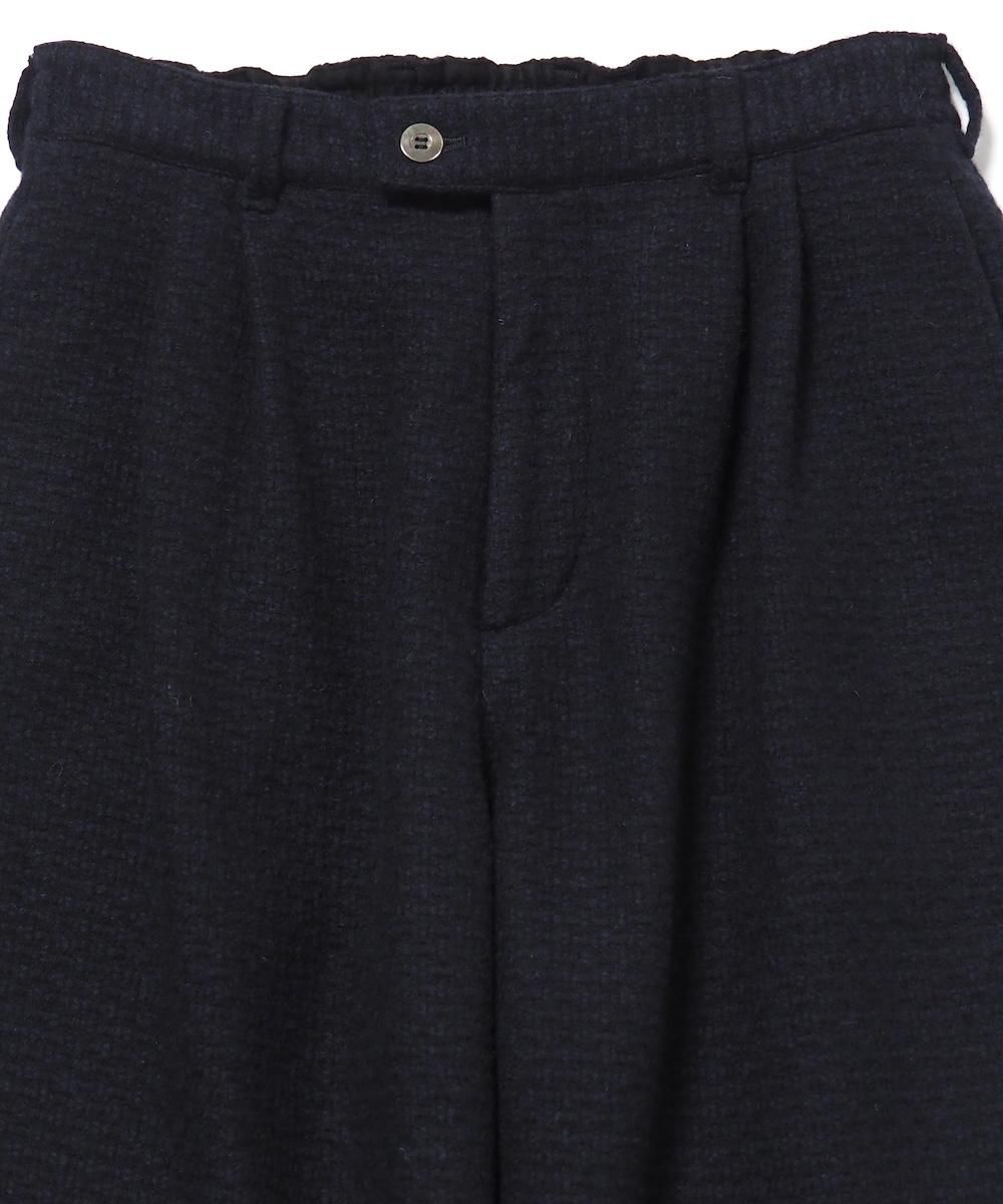 凹凸感のある豊かな表情が特徴のウールポリ生地を使用したスラックス。 糸自体を多色使いし、さらに多本取りで織ることでとてもユニークな素材感となっています。 シルエットは腿周りゆとりをもたせた程良いワイドなテーパード。 ウエストは後ろのみゴムの入ったリラックス仕様でほどほどに伸縮性があります。