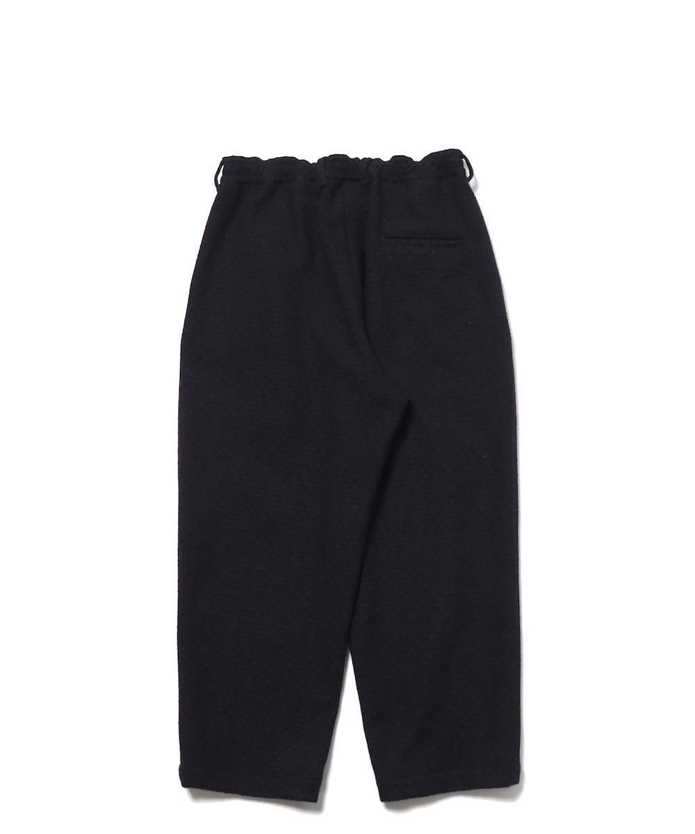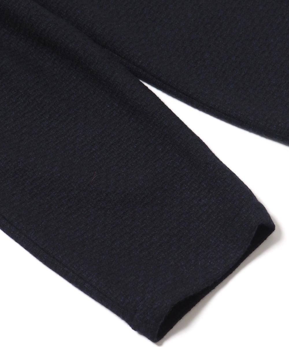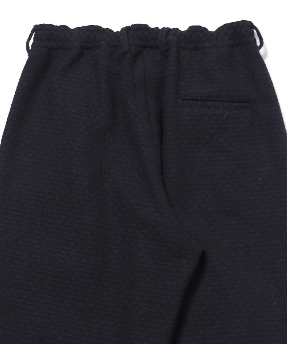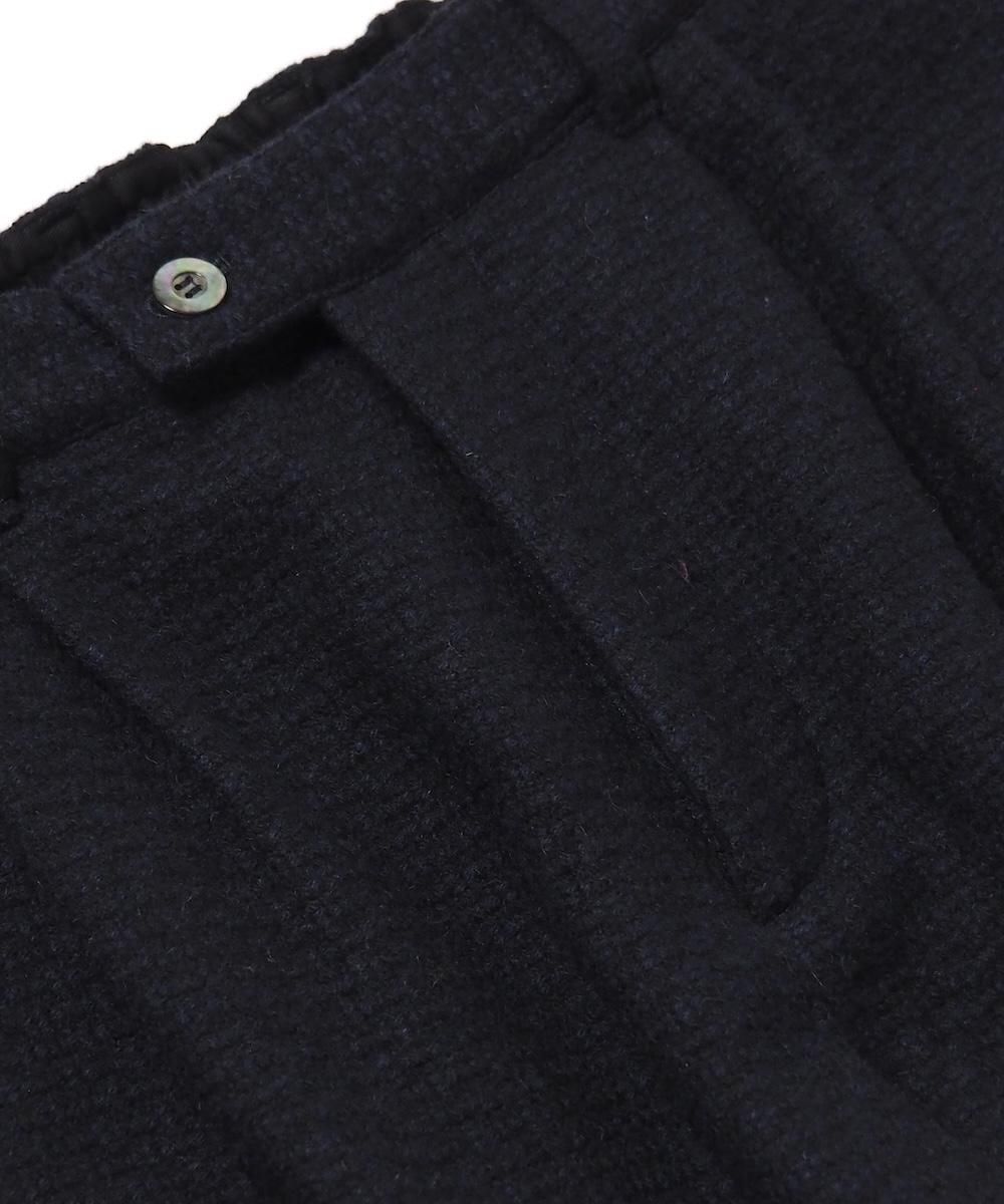 凹凸感のある豊かな表情が特徴のウールポリ生地を使用したスラックス。 糸自体を多色使いし、さらに多本取りで織ることでとてもユニークな素材感となっています。 シルエットは腿周りゆとりをもたせた程良いワイドなテーパード。 ウエストは後ろのみゴムの入ったリラックス仕様でほどほどに伸縮性があります。