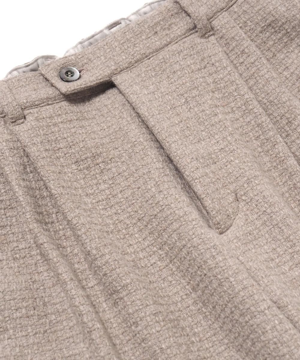 凹凸感のある豊かな表情が特徴のウールポリ生地を使用したスラックス。 糸自体を多色使いし、さらに多本取りで織ることでとてもユニークな素材感となっています。 シルエットは腿周りゆとりをもたせた程良いワイドなテーパード。 ウエストは後ろのみゴムの入ったリラックス仕様でほどほどに伸縮性があります。
