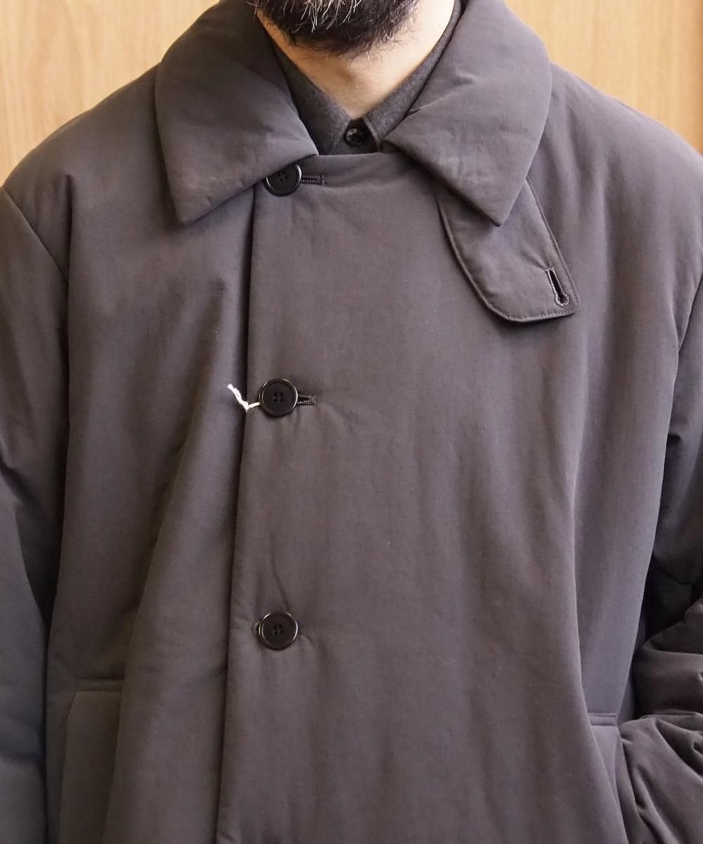 シンプルなデザインながらもふっくらとしたフォルムが目を惹く中綿コート。 表地は撥水性のあるナイロン生地を使用し、とても軽量で中綿の程良い温もりを感じる着心地です。 特徴的なのは裾にかけての綺麗なシルエット。 いわゆるダウンジャケットなどとは一線を画す、とても洗練された美しいAラインシルエットです。 襟元に配されたチンストラップを使用して襟を立てての着用も可能です。 寒い時期でも単なる防寒性のみならず、大人の洒落感を楽しんでいただける一枚です。