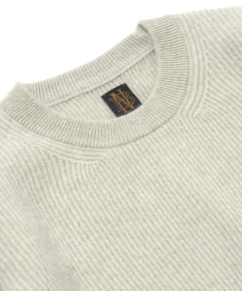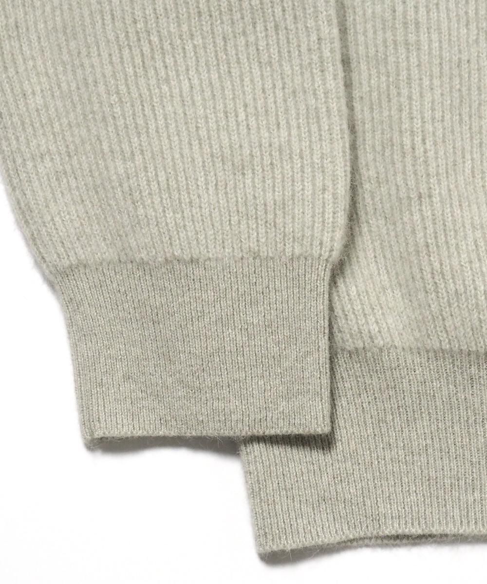 アルランシャンカシミヤにブルーフォックスをブレンドしたBATONERオリジナル糸を使用したクルーネックニット。 ブルーフォックスならではの上品な起毛感とカシミヤの柔らかさが特徴で、滑らかでとても軽くふっくらとした質感となっています。 セットインスリーブでリラックス感のあるシルエットは、シンプルながらも雰囲気のある佇まいに仕上がっています。