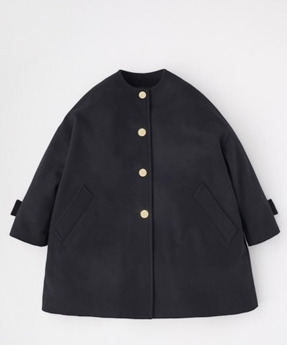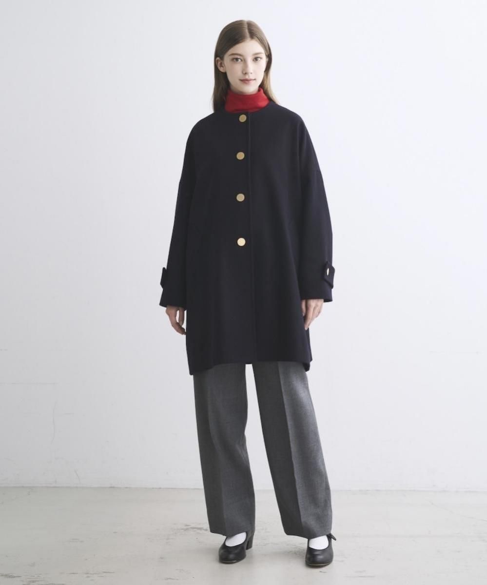 ドロップショルダーでオーバーサイズのノーカラーコート。 きちんと感がありながら、ゆったりとした優しいシルエットが魅力で、リュクスなドレス感のある装いから、カジュアルなデニムスタイルまで活躍する、着る人を選ばない万能コートです。 フラットなゴールドに輝くボタンが、きりりと全体の印象を引き締めます。 程良いハリと膨らみが特長のメルトン素材で、立体的なシルエットが際立ちます。