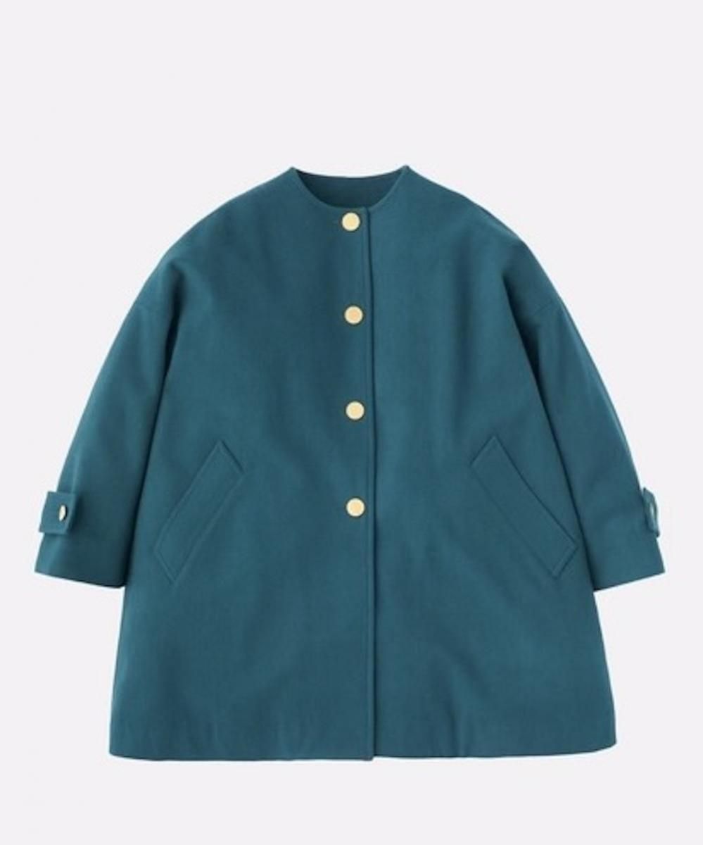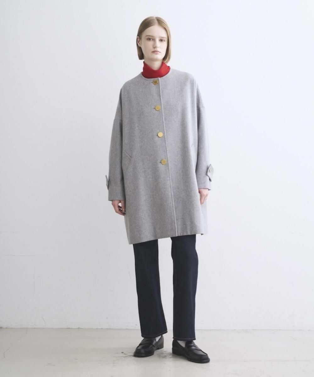 ドロップショルダーでオーバーサイズのノーカラーコート。 きちんと感がありながら、ゆったりとした優しいシルエットが魅力で、リュクスなドレス感のある装いから、カジュアルなデニムスタイルまで活躍する、着る人を選ばない万能コートです。 フラットなゴールドに輝くボタンが、きりりと全体の印象を引き締めます。 程良いハリと膨らみが特長のメルトン素材で、立体的なシルエットが際立ちます。