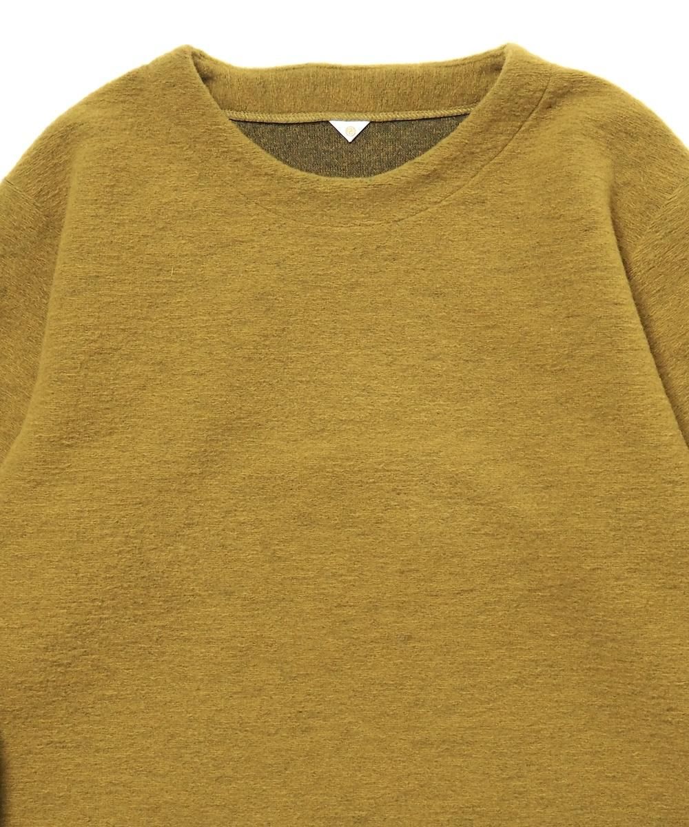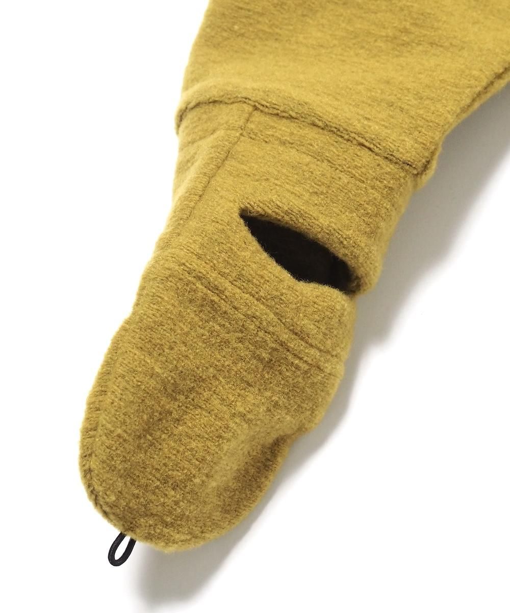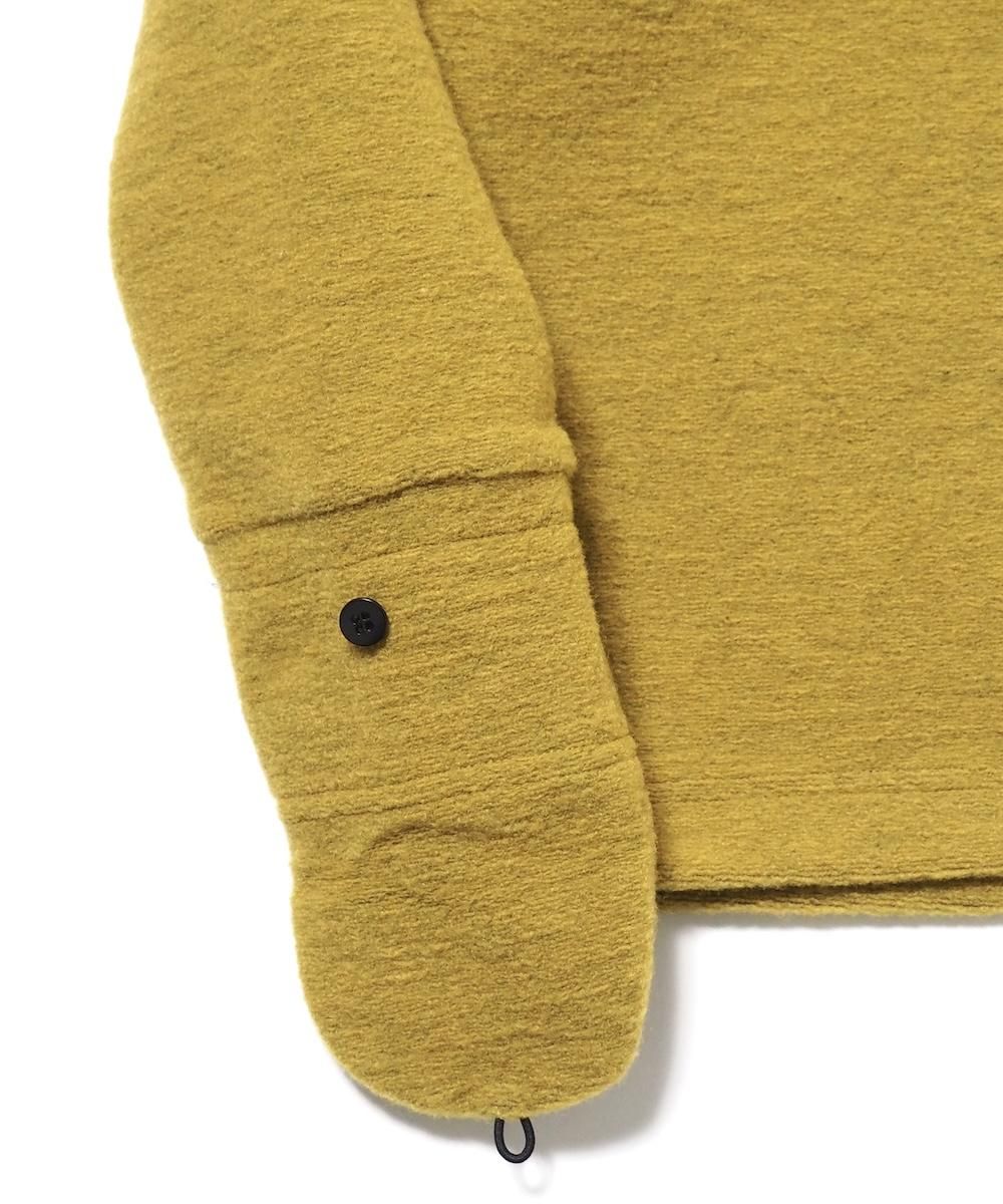 袖口にミトンを付けたようなデザインがユニークなプルオーバーニット。 ふくらみのある縮絨ニットを使用し、素朴で暖かみのある表情がポイント。 程良いゆるさのあるサイズ感ですので、一枚でも、重ね着でも着回しできます。 ミトンは折り返すことで収納可能です。