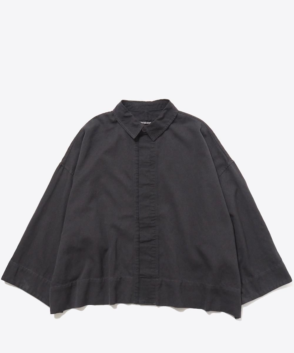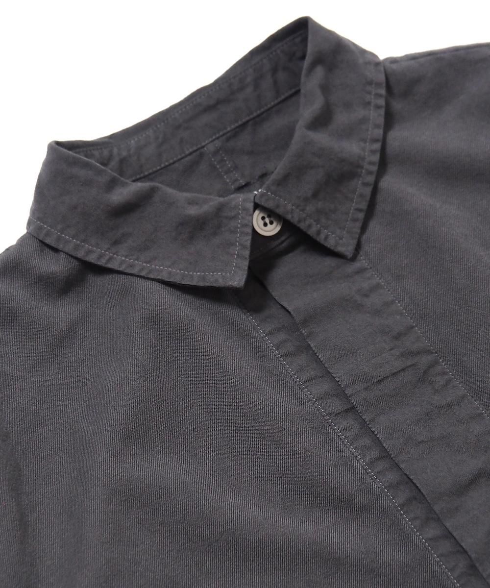 柔らかな素材感が魅力のプルオーバーシャツ。 デニムの産地である岡山県井原市の機屋にて織られた柔らかさが特徴のツイル素材です。 特殊な解撚処理を施した糸を使用し、洗えば洗うほど糸の撚りがなくなり柔らかさが増すのも魅力です。 前開きの裾のみ閉じられたプルオーバーデザイン。 衿と前立てには別素材を用いてハリを出し、端正な雰囲気もプラスしています。