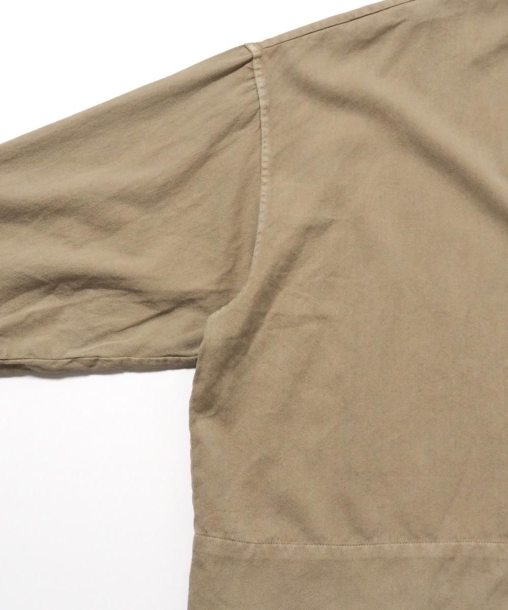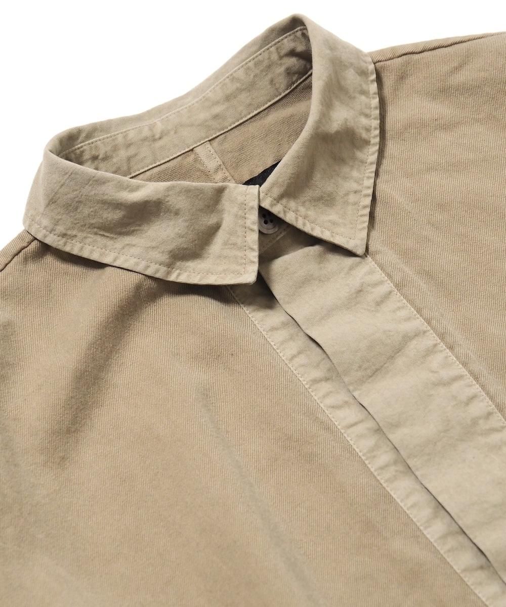 柔らかな素材感が魅力のプルオーバーシャツ。 デニムの産地である岡山県井原市の機屋にて織られた柔らかさが特徴のツイル素材です。 特殊な解撚処理を施した糸を使用し、洗えば洗うほど糸の撚りがなくなり柔らかさが増すのも魅力です。 前開きの裾のみ閉じられたプルオーバーデザイン。 衿と前立てには別素材を用いてハリを出し、端正な雰囲気もプラスしています。