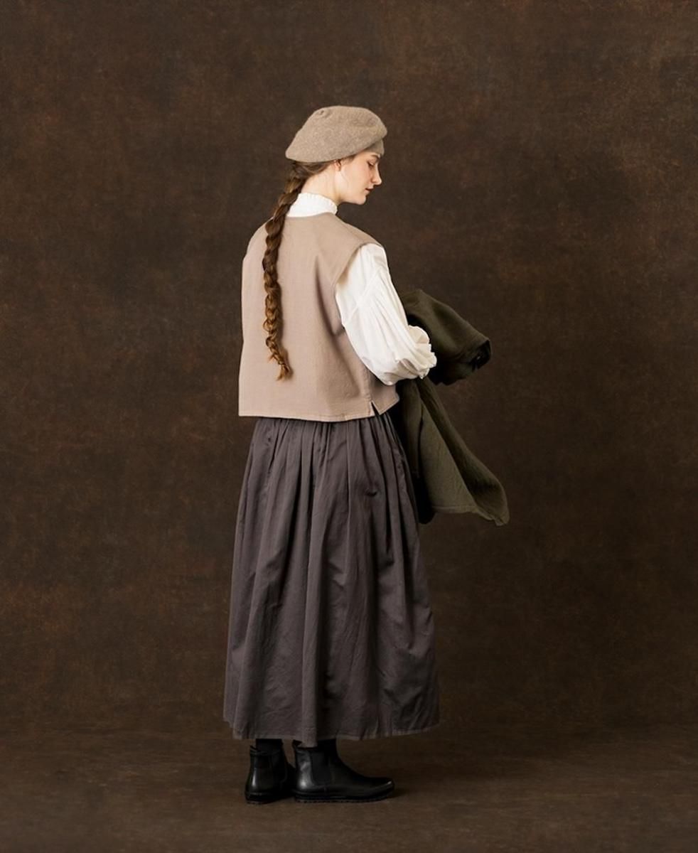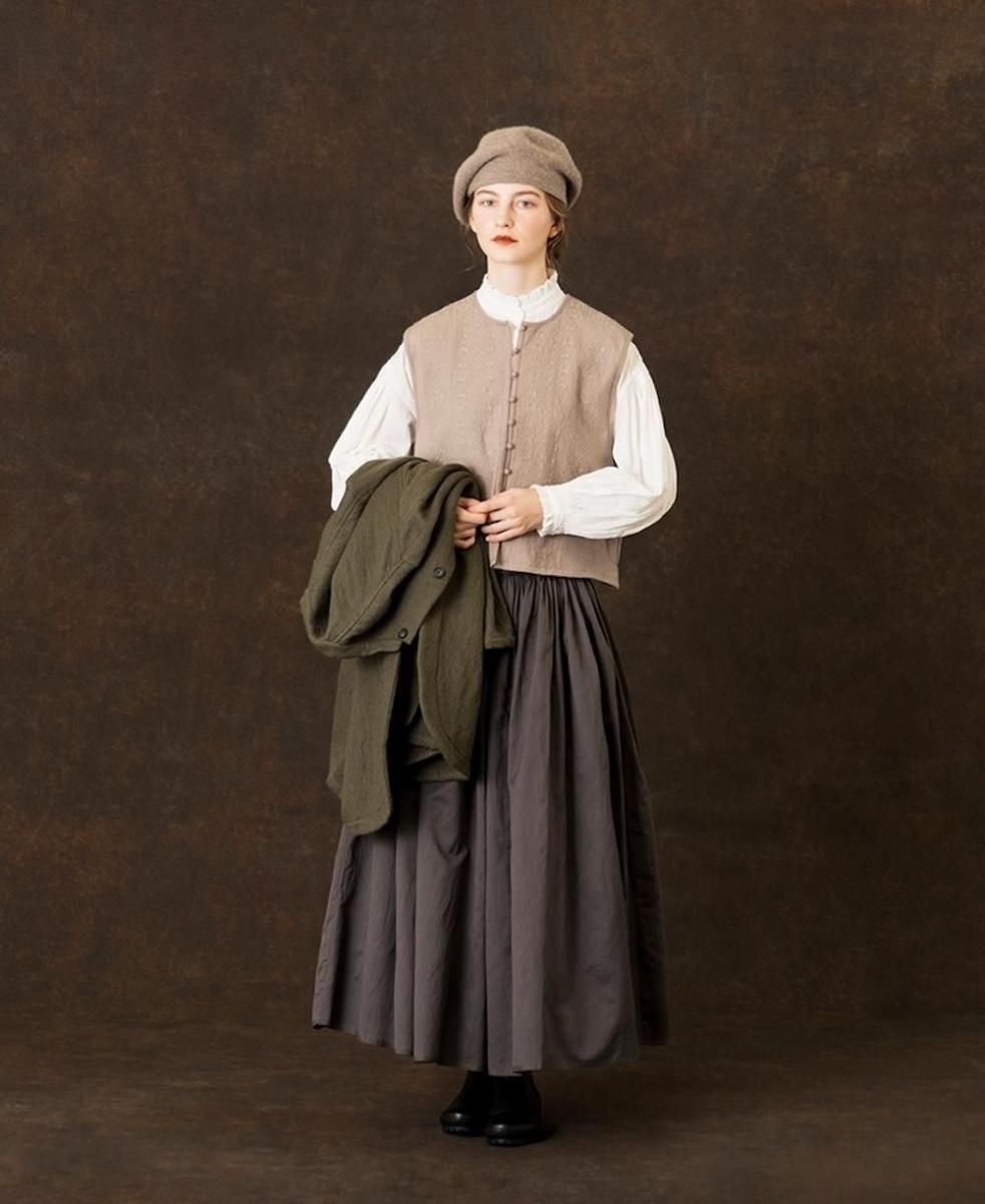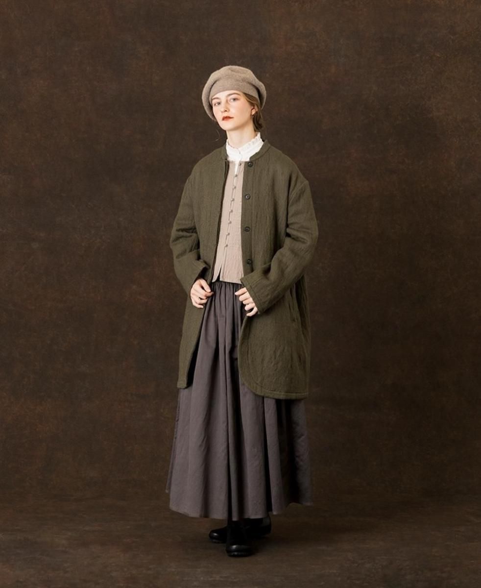 さらに軽く縮絨を掛けることで起毛感があり、生地が沢山の空気を含んでくれるので薄手ながら温かい素材感が魅力です。