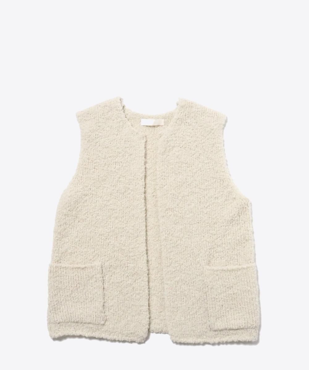 アルパカとウールを組み合わせたふっくらとしたボリューム感のニットベスト。 その素材感はシンプルな装いにも華やかさを添え、コーディネートのアクセントとして冬の装いを彩るアイテムです。