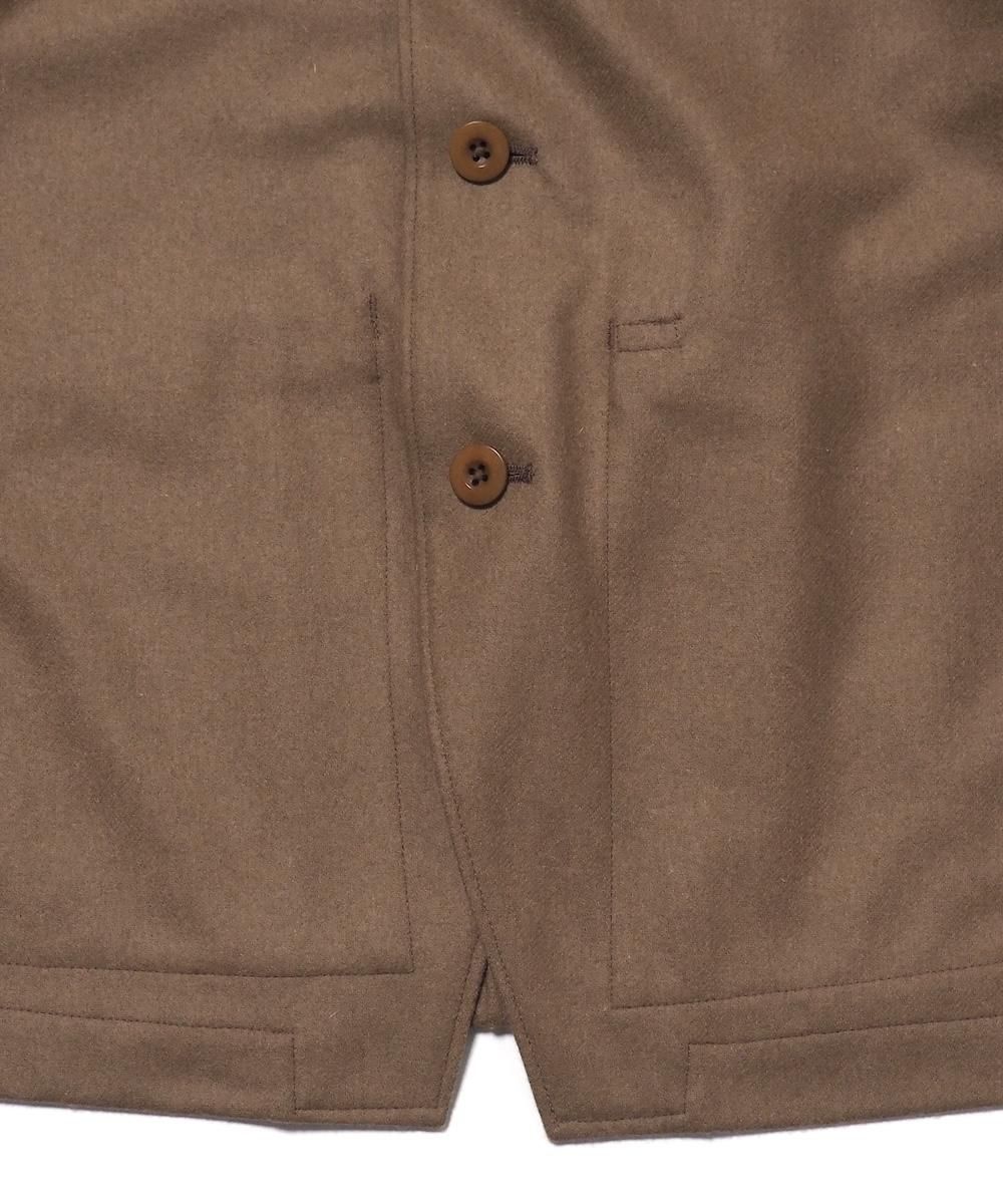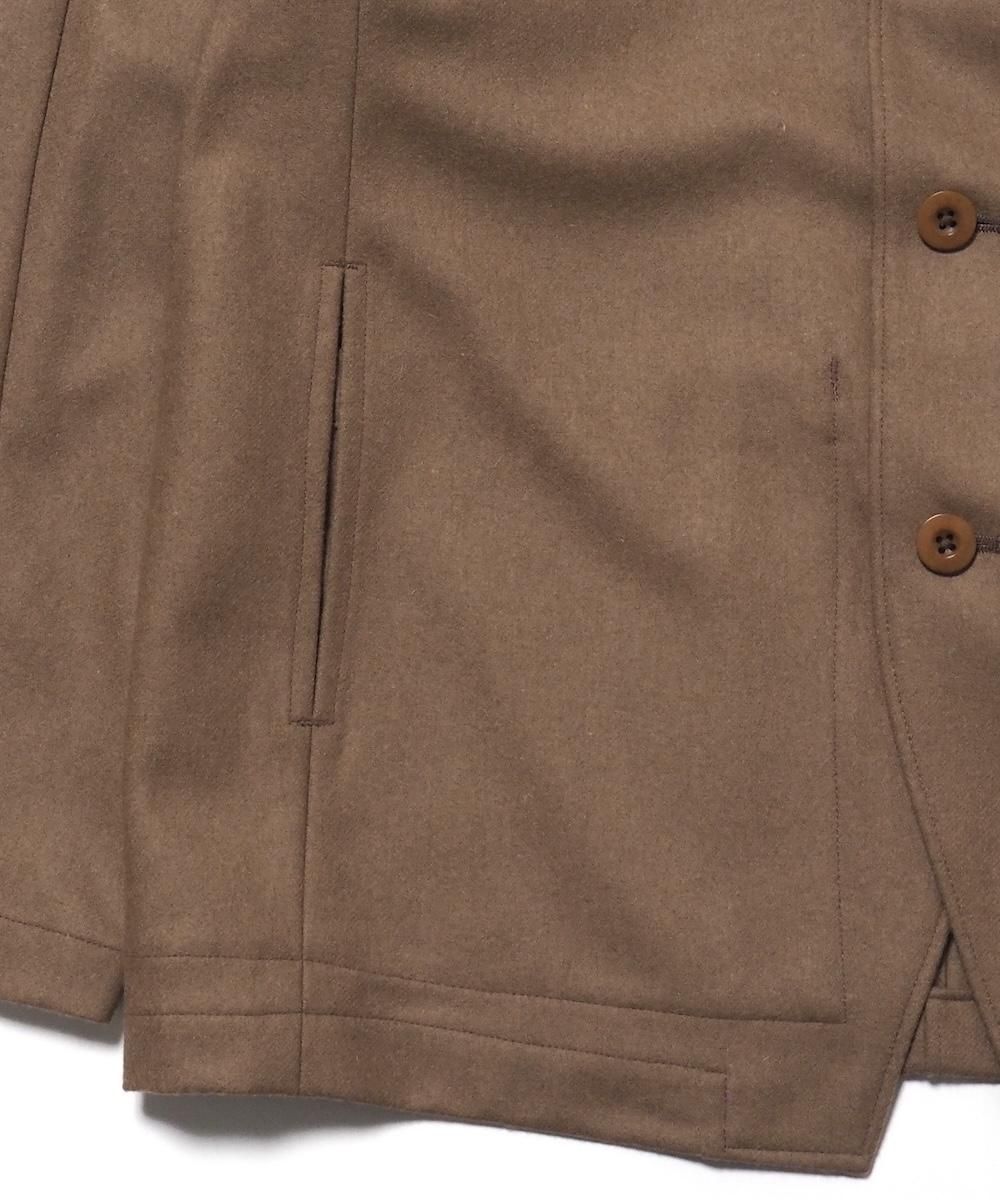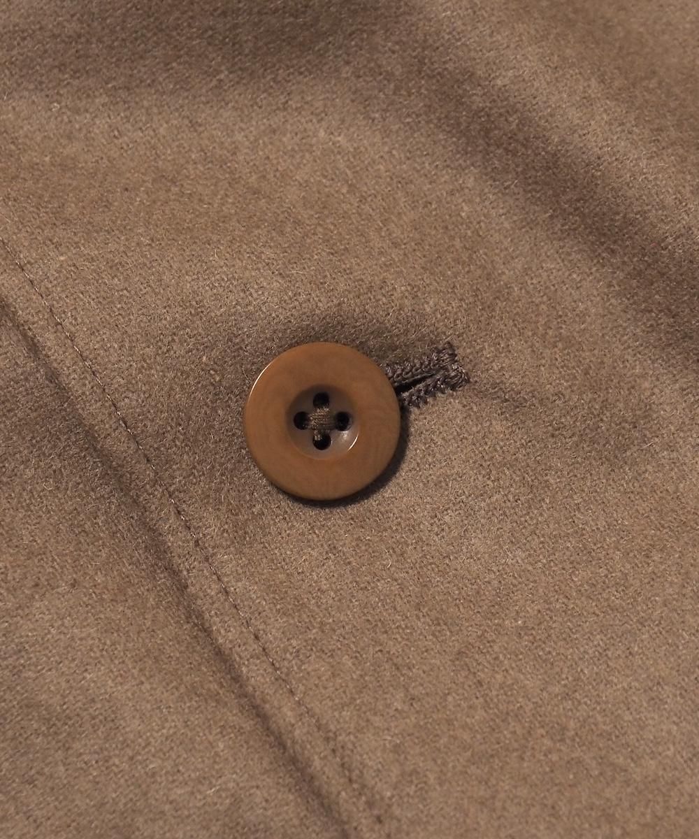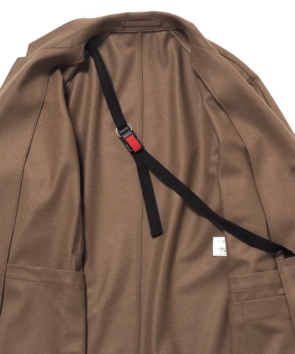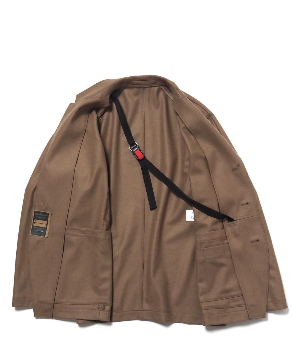 羽織として着脱がしやすいように、脱いだ際に手ぶらになるよう肩掛けが付いたジャケット。 肩周りの動き易さを追求するために、可動域の大きいブルゾンの袖パターンとサイズ感を採用しています。 そのためテーラードでありながらリラックス感のある雰囲気に仕上がっています。 素材にはベーシックなトップフラノ生地を使用。 綾織りで製織された綺麗な表情が特徴で、柔軟で弾力性・保温性に優れた素材です。