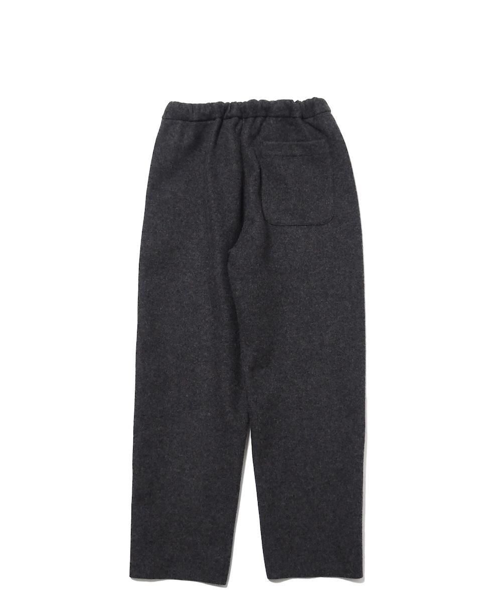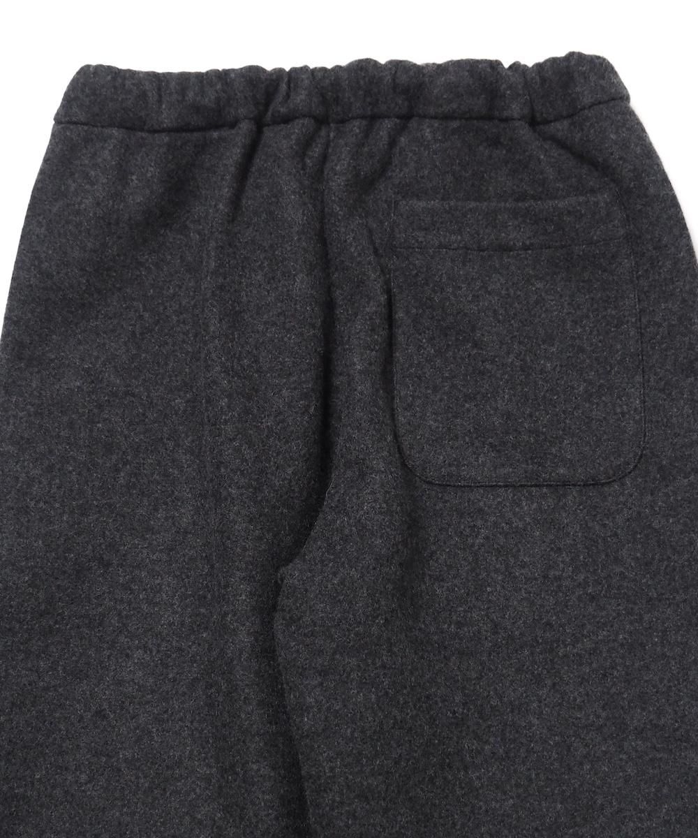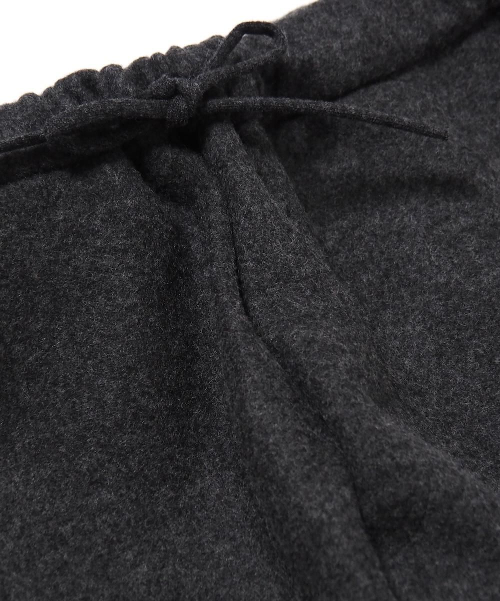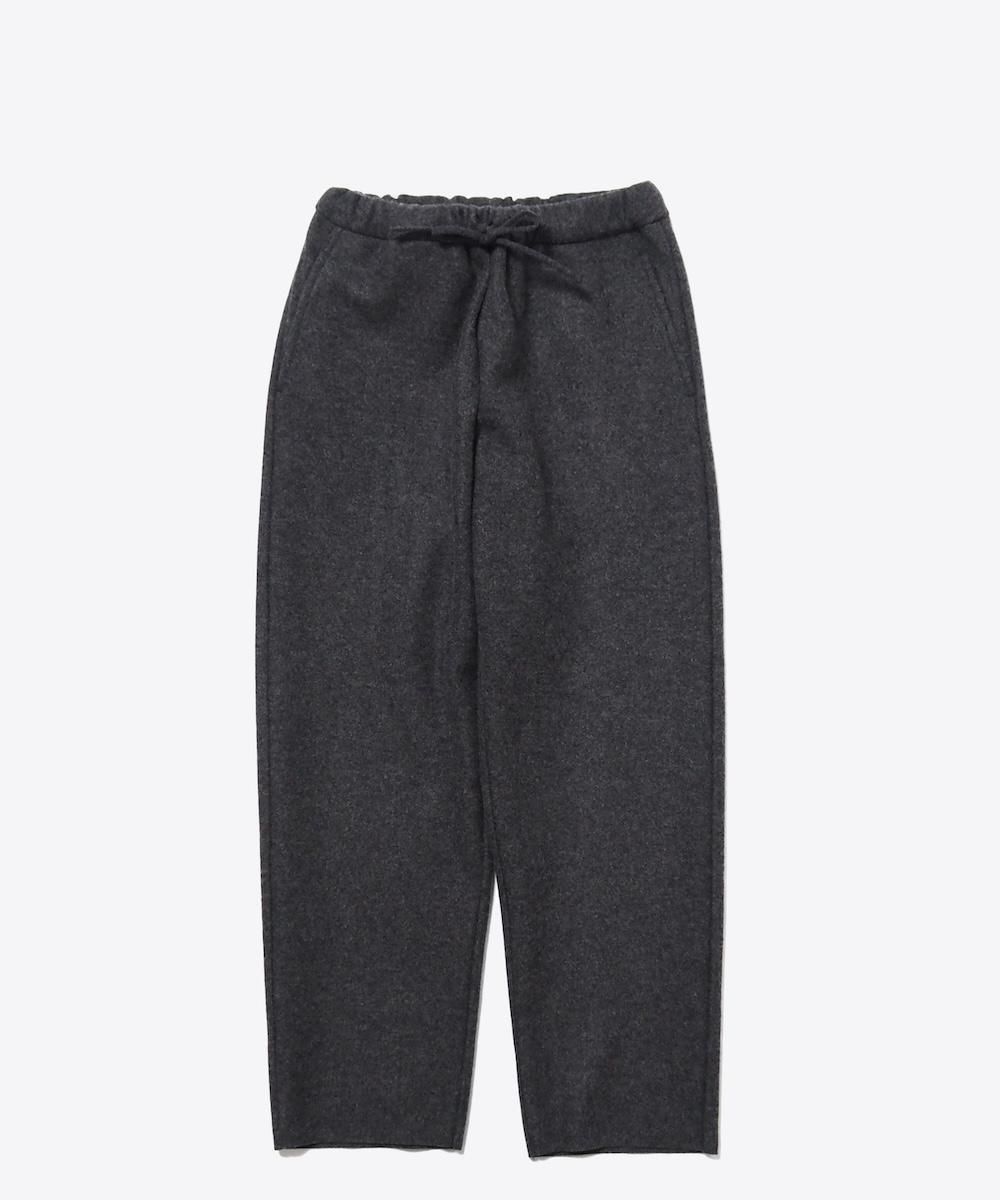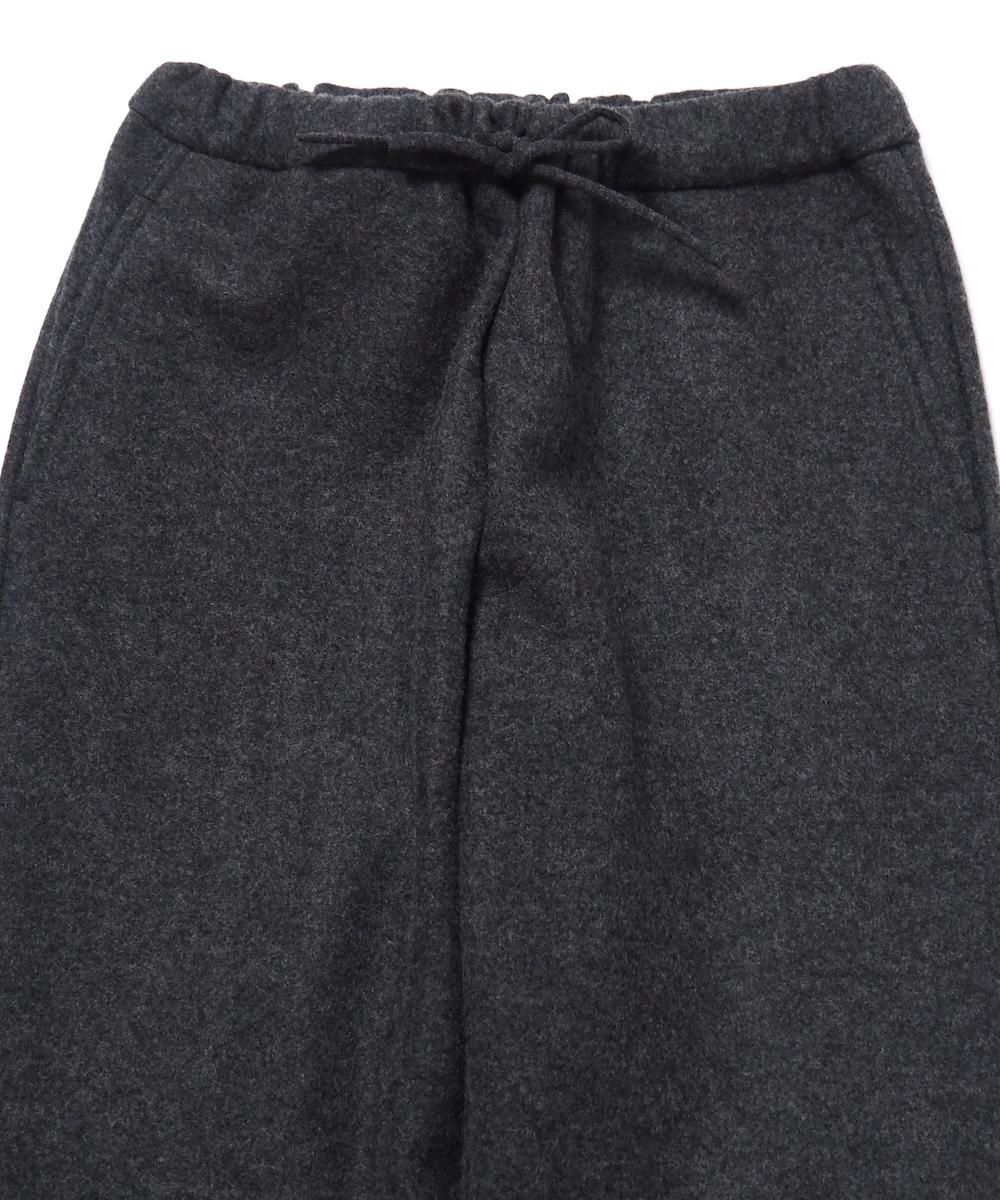 縮絨ウールでありながら、他とは一線を画す程良いコシとハリ感が特徴の生地を使用したイージーパンツ。 繊度が非常に細く、軽量で保温性にも優れたオーストラリア産のラムズウールに、 特有のぬめり感をもつ最上級ウールをブレンドし、 両者の特徴を融合させ、起毛と縮絨をかけています。 ソフトな肌触りと嵩高さがもたらす包み込むような着心地は、ついつい着てしまいたくなるような一着。