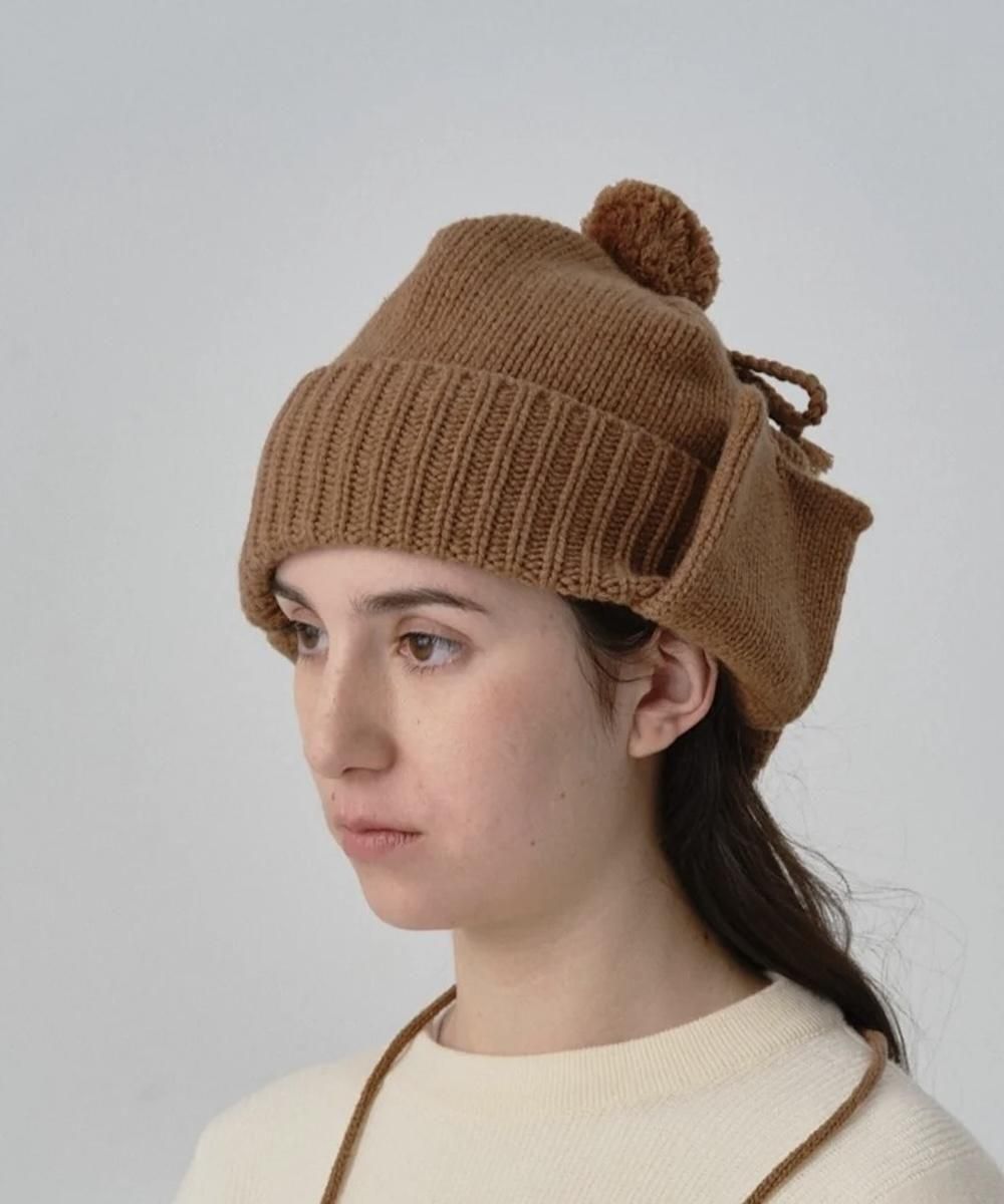 ふわっとした優しい風合いのエクストラファインラムズウールで編み立てたポンポンニット帽。 深めのシルエットは安定した被り心地です。 三つ編みのひもを垂らしレトロな雰囲気を持ちながらも、直線的なイヤープラップのデザインでエッジを効かせました。