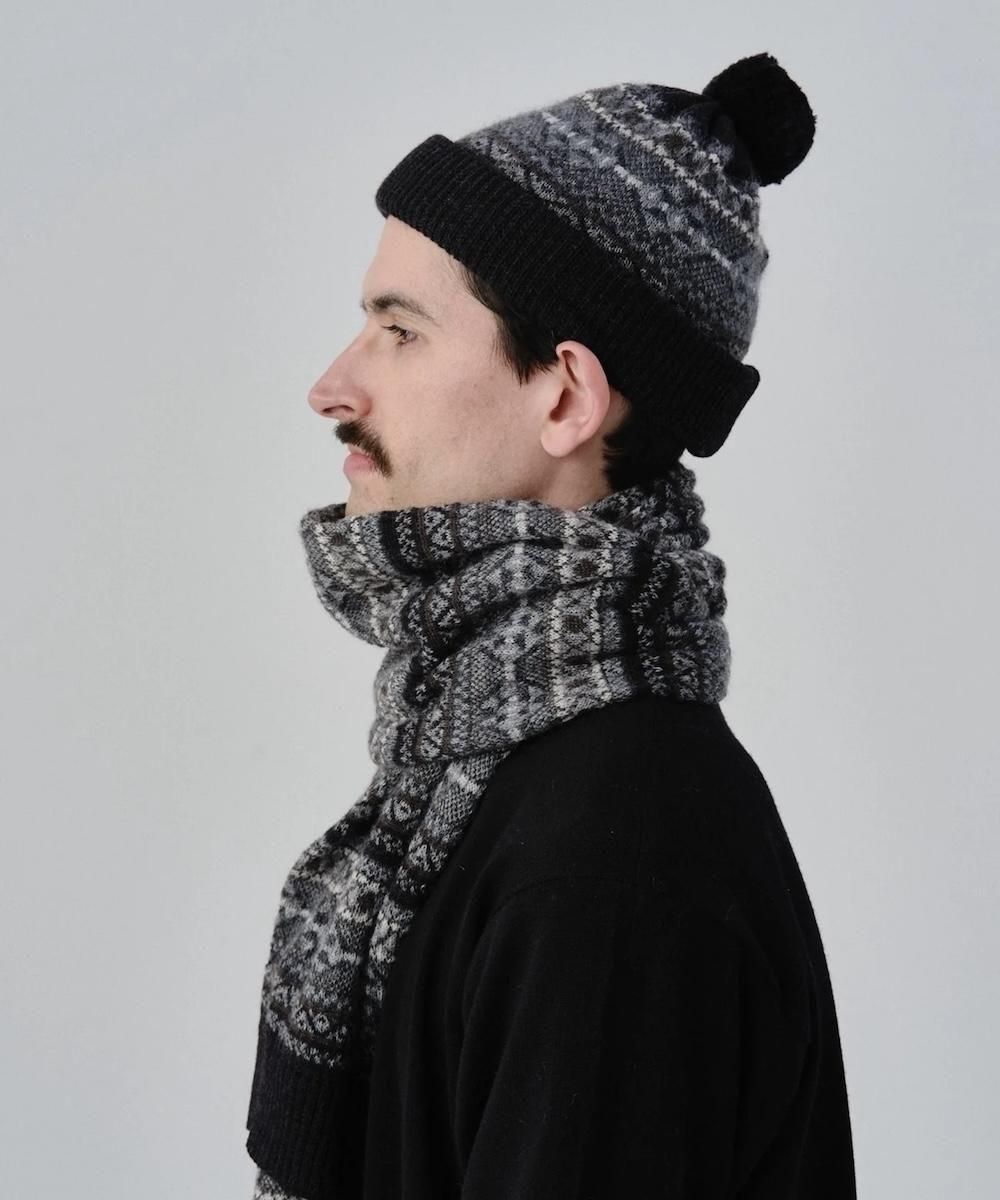 配色のバランスに拘ったフェアアイル柄のニット帽。 部分的にモヘヤを使い柄部分を柔らかな風合いに仕上げ、使用するたびに起毛感が増していきます。 トップには着脱可能なポンポンも取り付け、アクセントをプラスしています。 被り口は三つ折りのリブ編み仕様にすることでフィット性を考慮しました。